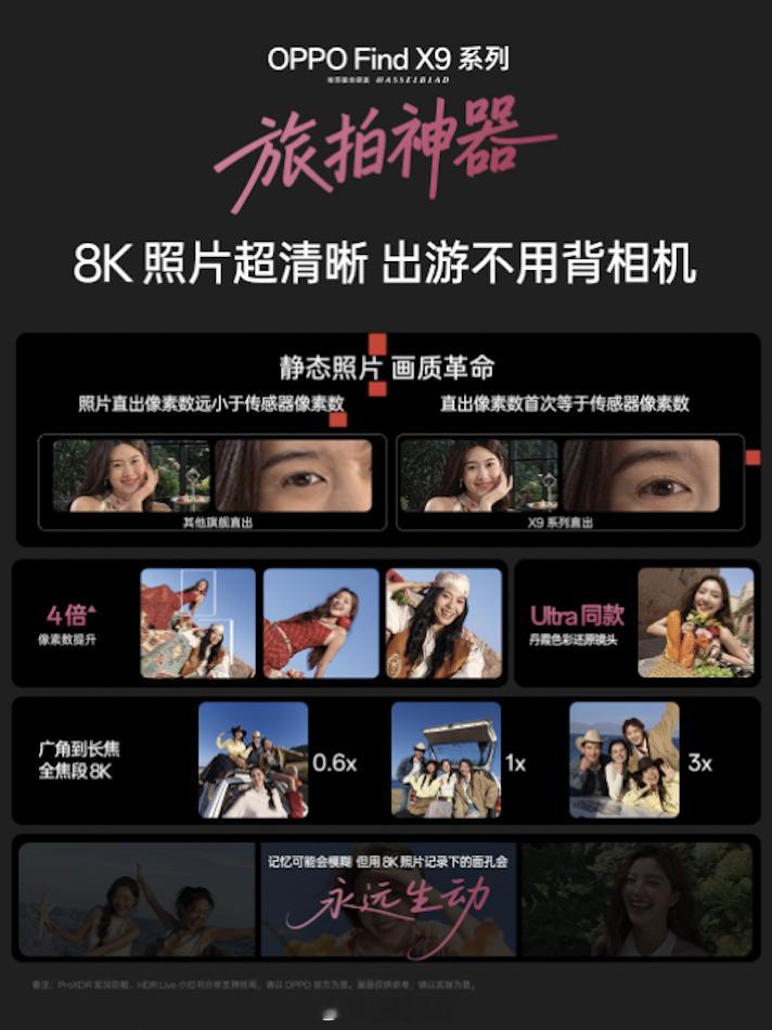 配合 LUMO 超像素引擎,打破传感器算力限制,实现「传感器像素 = 照片像素」,默认就有高像素与好画质。全系搭载 Ultra 级丹霞色彩还原镜头,色彩影调处处哈苏味,让 8K 照片从细节到色彩全面领先。前期随心拍、后期随心裁,人景皆美,旅拍尽兴,成为名副其实的「旅拍神器」! OPPO发布会OPPOFindX9首发4K超清实况 ,清晰度提升至 4 倍,帧帧都清晰,帧帧封面级。一次快门锁定 90 个 4K 瞬间,鲜活生动。还有 4K 慢动作实况、一拍多出,以及 4K 超清实况拼图等多种创意玩法,让实况也能随心花样出片。