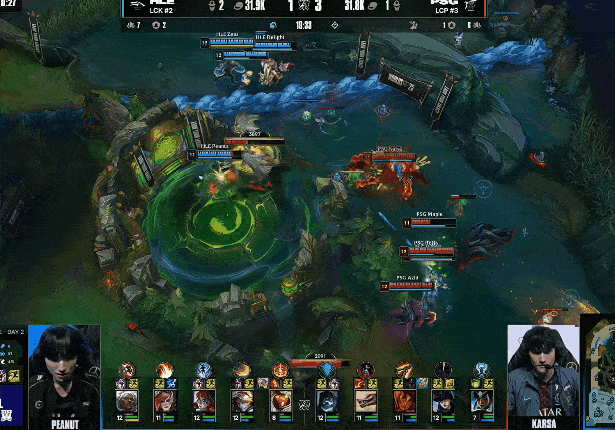 虎扑10月16日讯HLE团战阵型更优拿下小龙,随后Peanut果断开团击杀Karsa