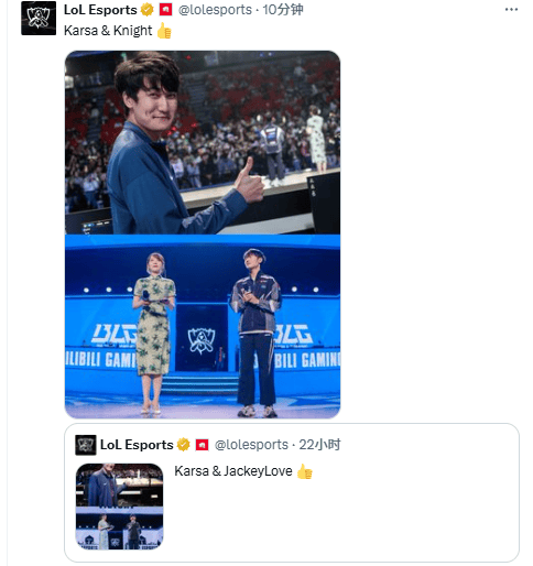2020TES羁绊,LOL官推晒Karsa在幕后给Knight比赞的照片