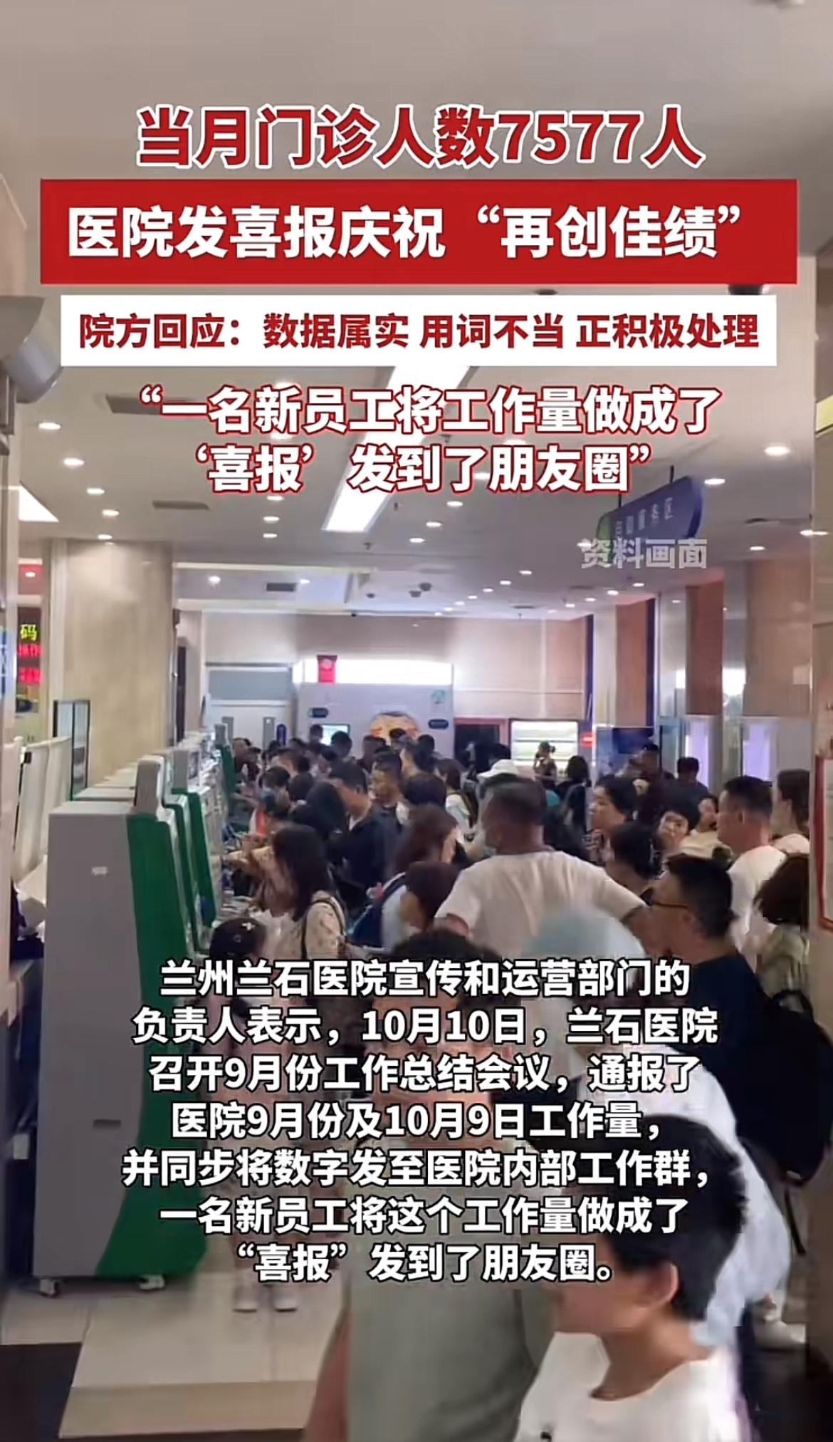 兰州兰石医院这“喜报”可闹大乌龙了。喜报里9月门诊7577人、手术426台,10月开诊首日门诊451人、手术25台,数据是真,但这说法太不妥,网友都质疑医院缺同理心。 原来这是新员工不懂规矩,把工作群里的工作量做成喜报发朋友圈了。医院也意识到问题,承认在思想意识和价值导向有偏差,管理有疏漏。现在医院在处理,上级部门也介入。这事儿给医院提了个醒,宣传做事都得慎重,得多多考虑患者感受。