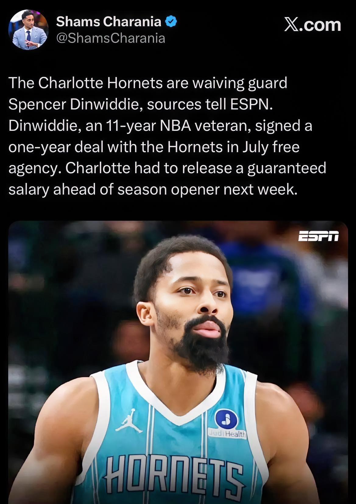 黄蜂官宣裁掉丁威迪,360万美金一分不少拿! 又失业了!如果没球队签他的话,估计离退役不远了。 据ESPN名记Shams报道,黄蜂队已经决定裁掉后卫丁威迪了。 要知道,丁威迪今年32岁,有11年NBA经验,今年7月才刚和黄蜂签了一年底薪。最关键的是,这360万美金是全额保障的,就算被裁,他也能一分不差拿到手。 #夏洛特黄蜂#