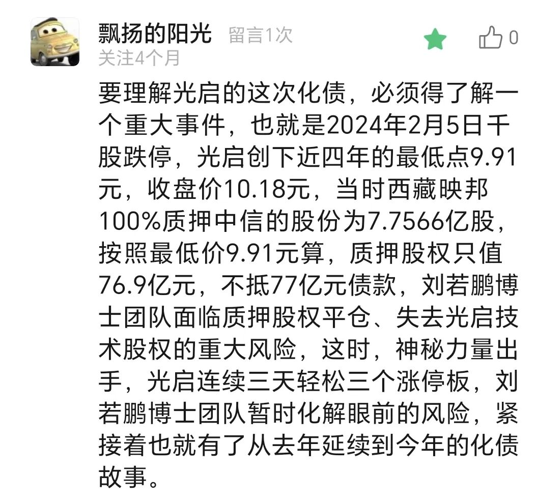 这也解释了为什么后来刘院团队要不惜一切代价化债,因为只有经历过绝境和绝处逢生的那种感觉,才能大彻大悟。只有把质押这个雷排掉,股权结构才稳定了,那些看重公司长期价值的机构资金才敢放心进来,你也理解刘院这两年东奔西跑推介光启的原动力。