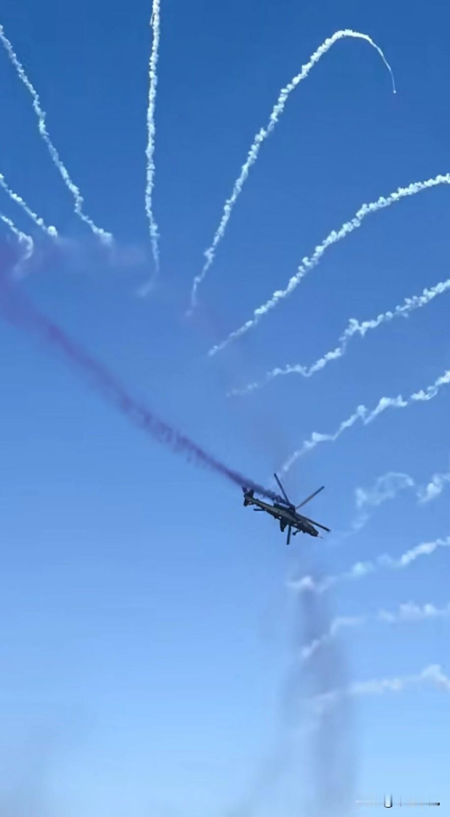 天津直博会,武直10飞行表演太精彩了吧? 武直10,边绕圈边释放干扰弹,这画面太美了,就是彩烟的颜色选的不太好吧?咋不用鲜艳的红色或者黄色呢?好像用的是蓝色,偏暗,甚至有些像黑色似的! 大家觉得呢?