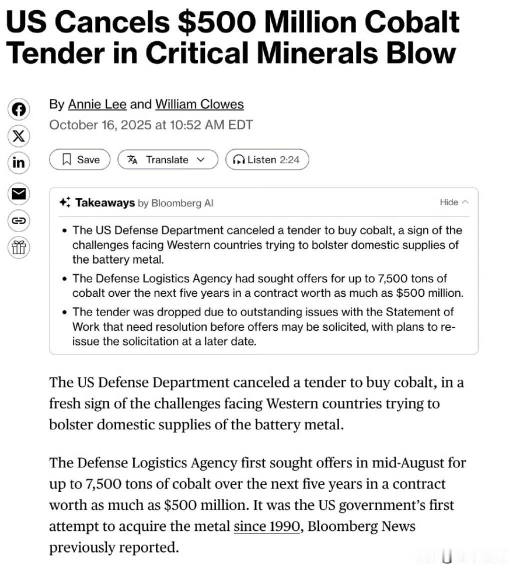 彭博报道,美国国防部取消了价值5亿美元7,500吨钴的招标,标志着美国强化关键矿产供应链的努力的尝试遭遇挫折。 此次取消是公开的原因是工作说明书存在未解决问题,尽管当局表示计划在未来重新发布招标。该事件凸显了美国及西方国家在减少对中国钴加工依赖、重建国内储备方面的困难。 美国政府原计划购买的钴量高达7,500吨,这是自1990年以来美国首次尝试储备该金属。招标对象包括加拿大、日本的企业。此举显示美国在减少对中国关键矿产依赖、确保电动车和军工供应链安全方面仍面临结构性挑战。