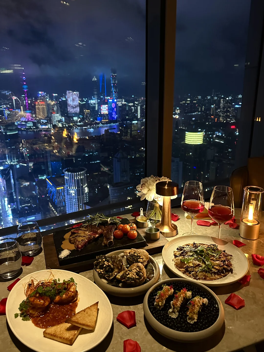 人广65层的云端餐厅,真的超大落地窗整个夜景尽收眼底 蛮安静的,可以看到外套三件套,下面也可以看到南京步行街,人均才300➕拍照好好看啊