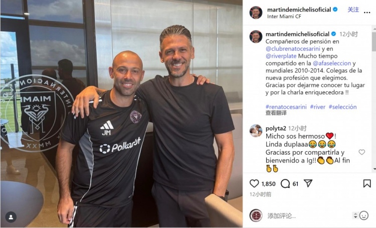 德米凯利斯造访迈阿密国际俱乐部,并与迈阿密国际主帅、昔日队友马斯切拉诺合影,他在社交媒体上晒出合照,配文:“我在切萨里尼(河床青训)和河床的室友,我们不仅在2010年、2014年世界杯上为阿根廷并肩作战,如今更成为教练同行。感谢你让我领略你现在的天地,这次交流令我受益良多。”