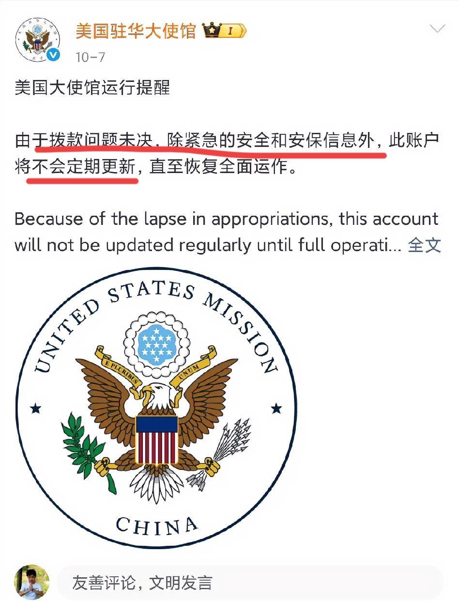 美国驻华大使馆“太敬业”了!为了抹黑中国,停更的官方又悄然复活了! 因为没钱停更的美国驻华大使馆官方突然发文了,又“不惜代价”地推卸责任+抹黑+胡说八道了,或许是有人资助了,他们的小编不会免费干活的,毕竟美国劳动法很严格的! 十月七号,该官方账号还表示“拨款问题未解决,不会定期更新”,或许政府停摆问题有解决方案了。