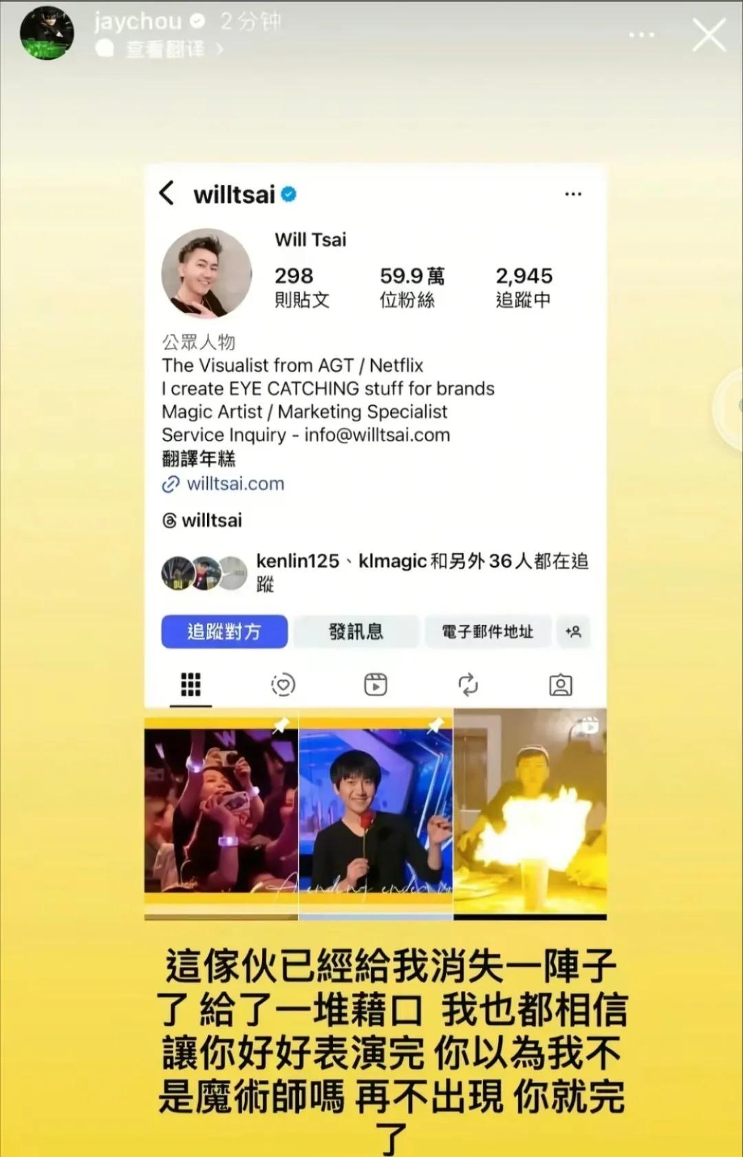 周杰伦连发动态,警告魔术师好友蔡威泽“再不出现就完了”! 当年蔡威泽在美国达人秀封神,周杰伦立马拉着他上《周游记》,带他登春晚,跑世界巡演,2023年庆生时还喊着互相扶持。 作为周杰伦综艺《周游记》及巡回演唱会的固定成员,蔡威泽此前一直被视作周杰伦的“快乐小伙伴”团队重要成员。谁能想到,如今因为资.金.纠.纷闹到这份上,连周杰伦的公司都收到了法院催讨文件,真友谊的小船说翻就翻啊! 事件起因是,杰威尔音乐去年给蔡威泽公司投了1亿新台币做《周游记2》魔术环节,约定到期还本分润,但蔡威泽只还了十分之一,剩下的拖着不还,签的本票还是空头支票,催讨无果。 周杰伦在社交平台上已取消对蔡威泽的关注,称对方消失许久、借口不断,自己不再相信。并严厉喊话让他赶紧出现,不然就完了。 这意味着两人好友关系的破裂。周杰伦是信了朋友才投资的,结果被拖欠还失联,换谁都生气吧?只能说涉及到钱的事,哪怕是朋友也要谨慎小心啊,不然最后连朋友都做不成。