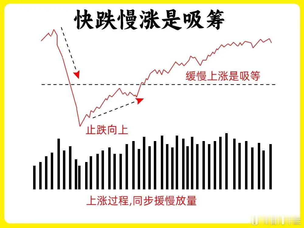 股价处于低位或是上涨趋势的初期,在分时图里,股价短时间大幅下跌,这是主力故意打压股价,随后股价止跌向上反弹很慢,向上的斜率很小,这是主力偷偷的承接抛盘的筹码,整个吸筹阶段,缓慢上涨时间会比较长,而且成交量会比较温和,不会和下跌时候,成交量那么大。