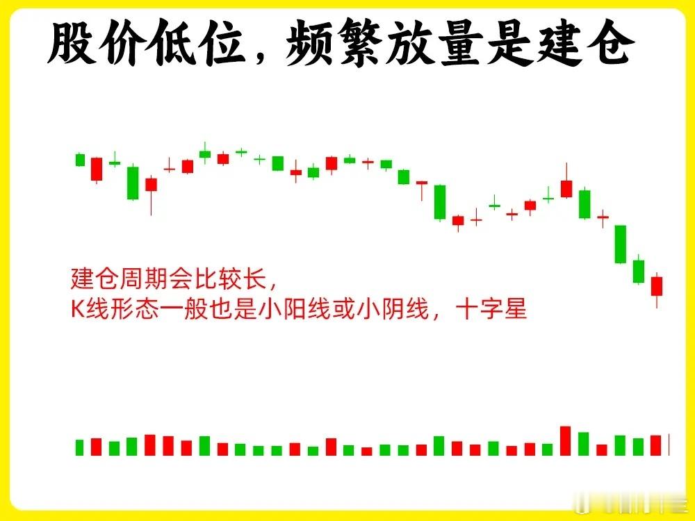 股价经过长时间的阴跌以后,开始低位横盘,成交量出现逐步放量,股价却没有出现明显的上涨,随后股价开始缩量,成交量会处于一种逐步放量在缩量,回归到平均水平的一个过程,这往往就是主力在低位偷偷建仓,当然这种建仓周期会比较长,K线形态一般也是小阳线或小阴线,十字星