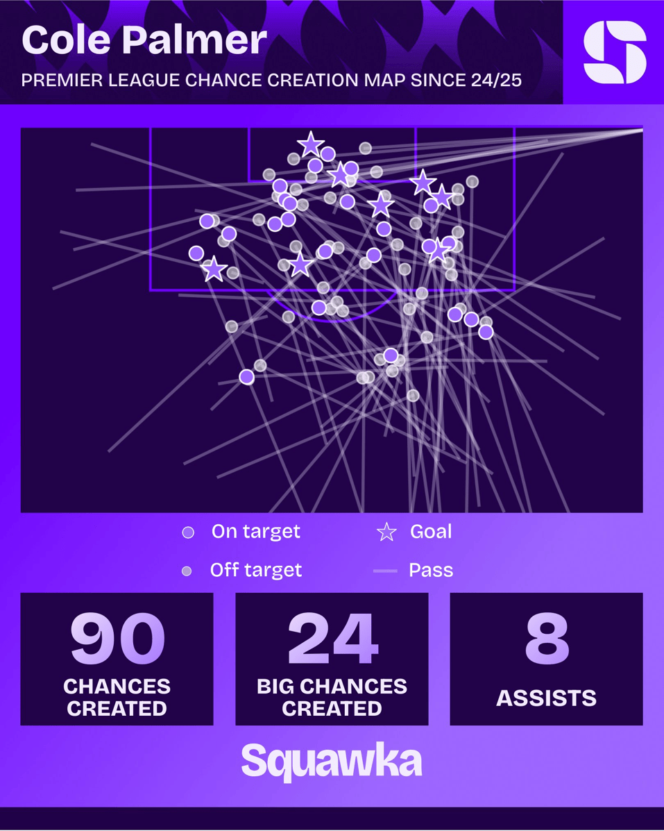 虎扑10月17日讯根据Squakwa的统计,自上赛季开始以来,只有萨拉赫(30)在英超联赛里创造的绝佳机会比帕尔默(24)更多。