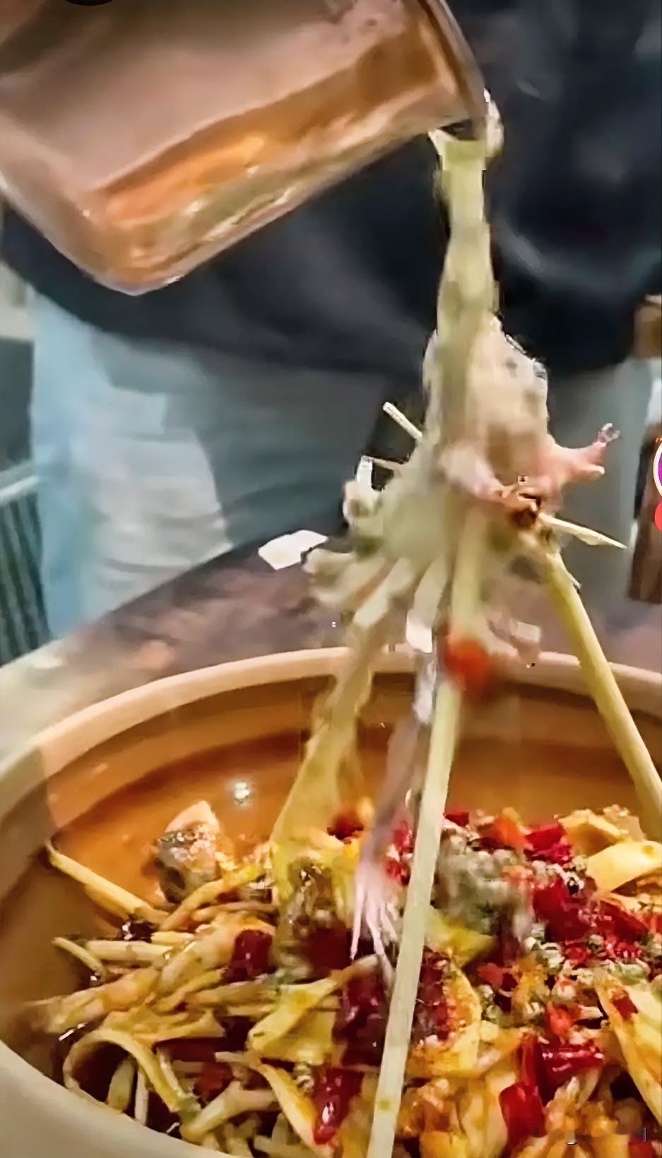 这道菜太残忍了。把刚破肚的蛙架在三根撑起的筷子上,身上还贯穿牙签,然后一锅滚烫的热油从蛙头上倾泻而下,蛙被烫的全身肉质紧缩。不明白现在的菜吃就吃,为什么要当着食客的面把前奏怎的那么残忍,吃之前不念句“阿弥陀佛”还真不好下嘴。哎。。。。