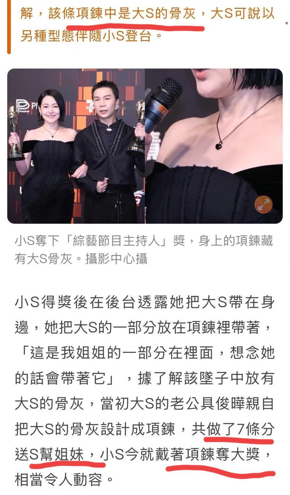 关心八卦的都知道,大S仙女帮,后期感情也就那样。 具俊晔做了7条“特殊意义版”项链,分给“姐妹团”,就没想着多做两条给孩子吗? 本来看小S金钟奖戴着的这条项链挺感动的,毕竟项链有特殊意义。 结果细看内容:7条?姐妹团?瞬间无语。。。 你给她们这项链,说不定过段时间就被扔到角落吃灰了。 反观孩子们,那可是实实在在的亲人啊,他们收到这份礼物该多开心。 具俊晔这样的做法,感觉他只关注到了所谓的“明星姐妹团”,却忽略了失去亲妈的继子继女。 总觉得有些表面功夫,大家觉得呢?