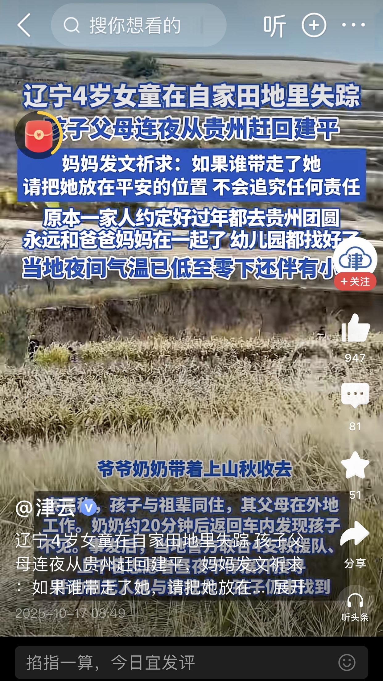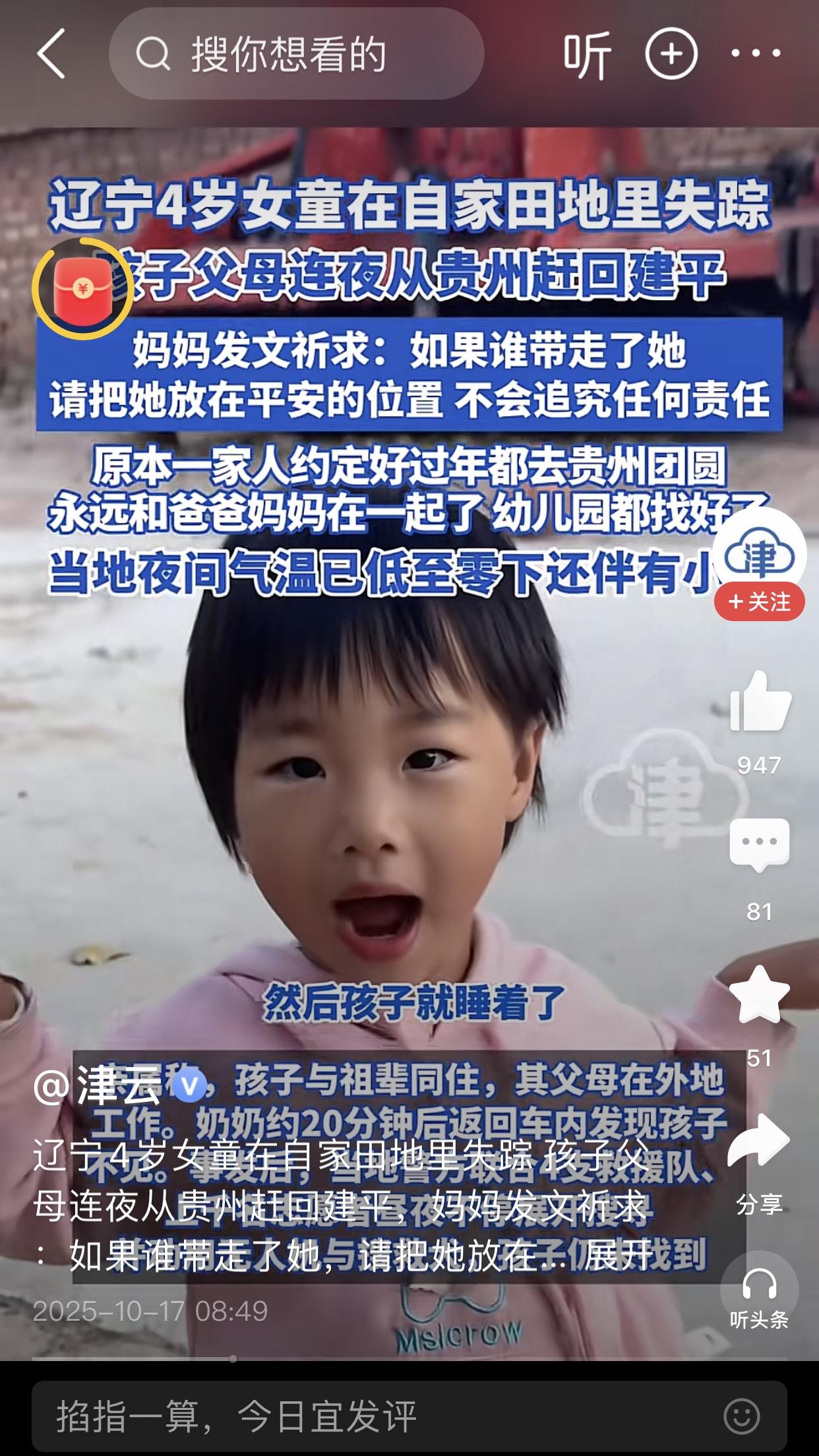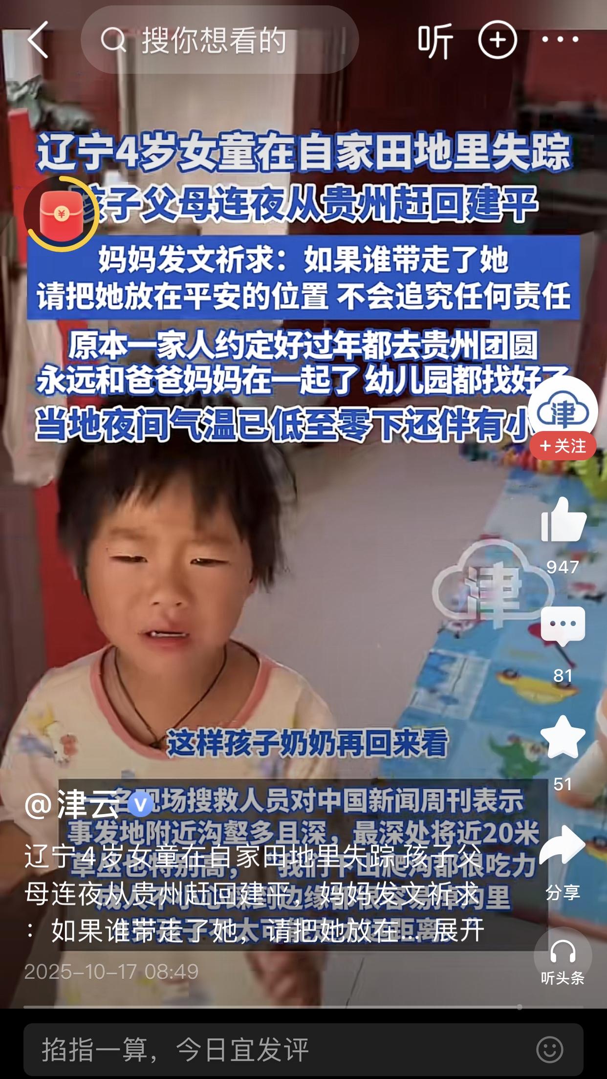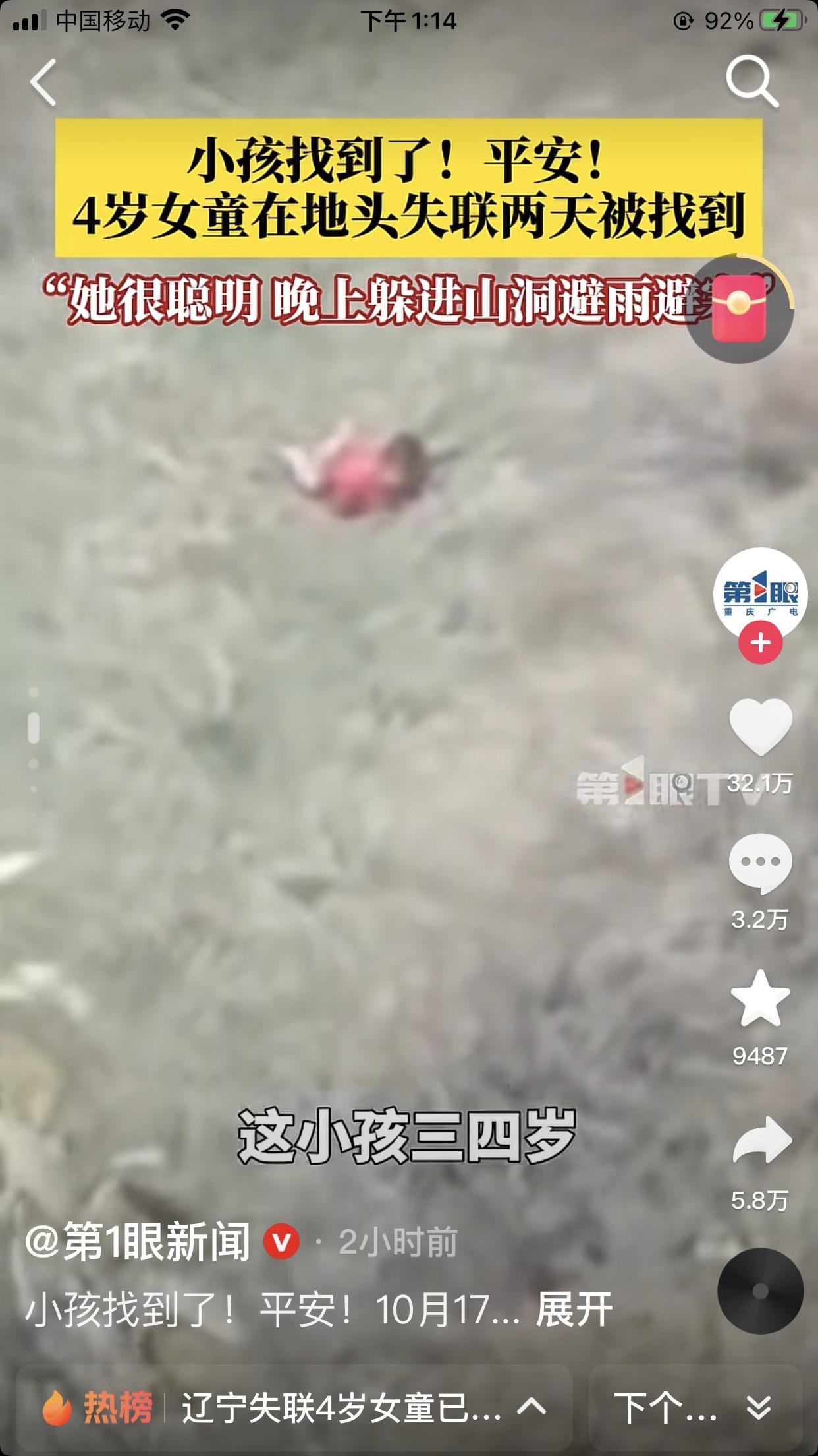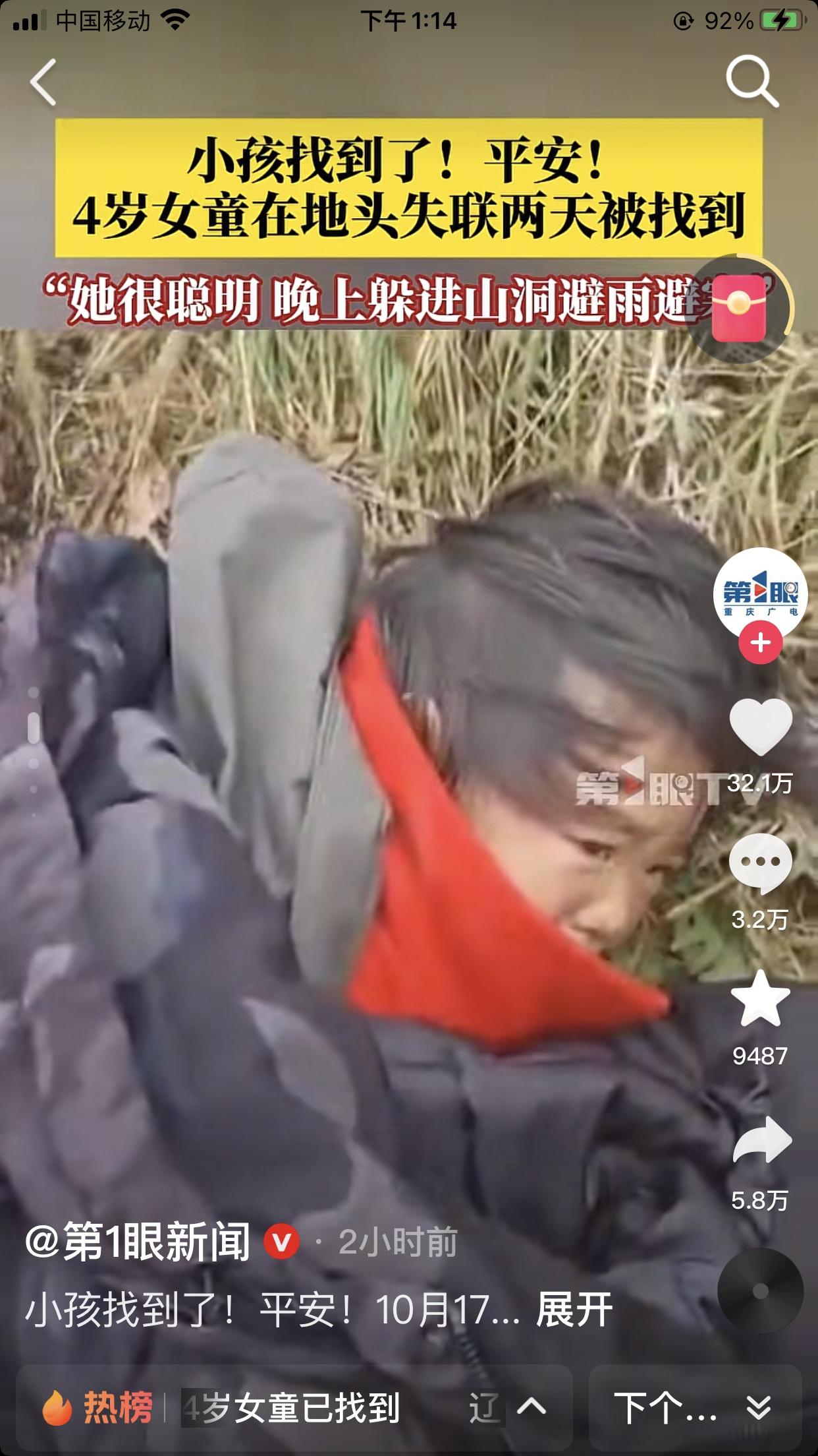 4岁女孩已经找到,15日下午女孩随爷爷奶奶上山秋收,独自在面包车上睡醒后走失,44个小时是一万多人参与救援了,背后还有整个东北三省的牵挂,昨天晚上我敢保证整个东北三省只要知道这个事的都没睡好觉,这就是东北人的团结[呲牙] 幸运的是这小女孩穿了红色的衣服,无人机发现山沟里有红色的点点,这孩子也够聪明,昨晚上下雨她竞钻进山洞里,东北现在夜间已经到零下,很冷,如果再挺一天都不一定活着。