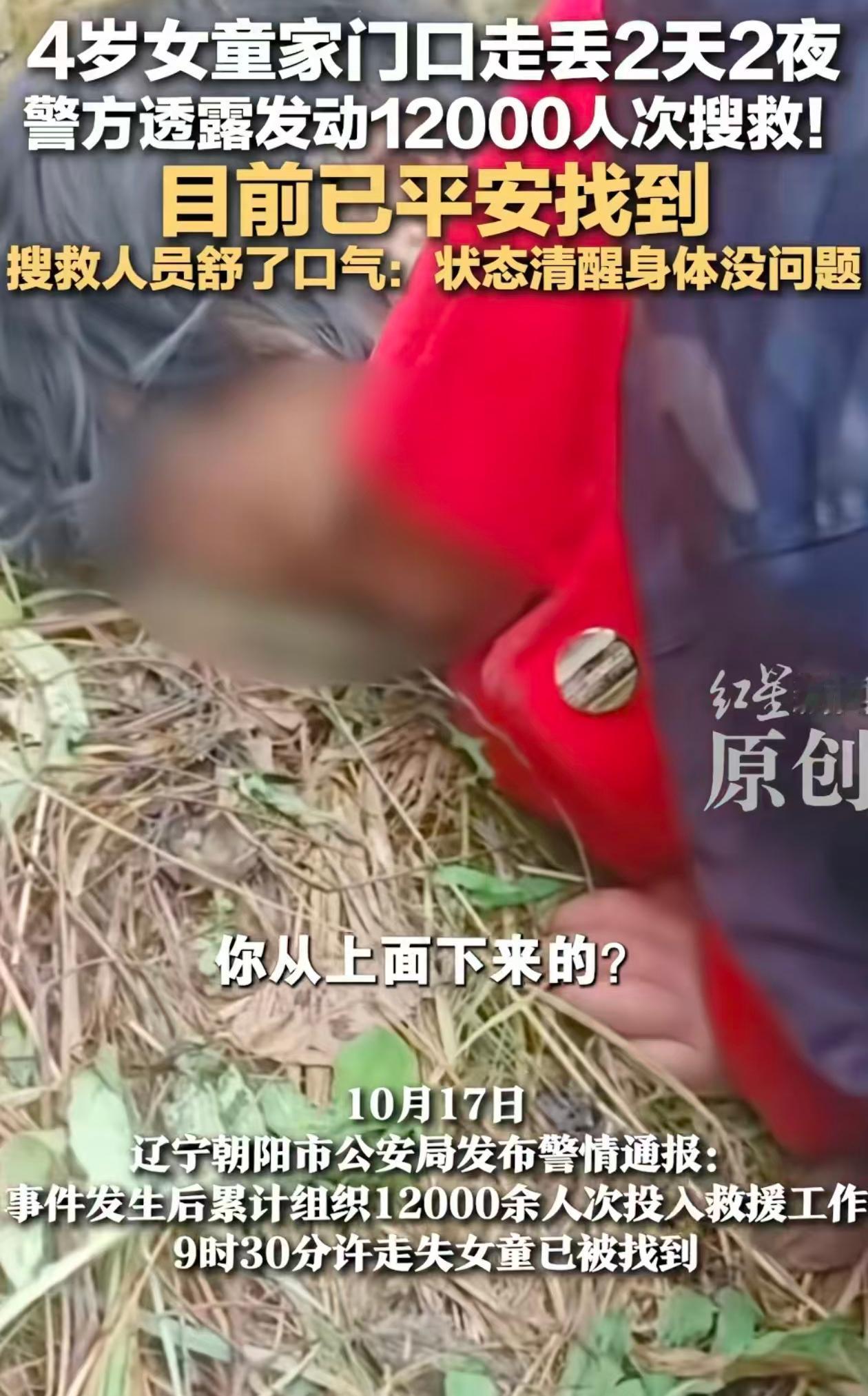 东北人真是爱吃饺子啊,4岁小女孩被找到,第一件事就说要吃饺子! 网上好多人说小女孩是遇到人贩子,但是按小孩子正常的心理是,在车上突然醒来,见到周围没人,第一反应就是找大人,找不到就会继续找,不会在原地等,而且小女孩也说了她是摔到沟里的,所以遇到人贩子的概率不大。 孩子还是幸运,摔到沟里,估计摔伤了,呆了两天两夜,东北这段时间晚上温度已经零下,幸好没碰到野兽啥的,但是应该把孩子吓得够呛。 这件事最让人感动的是,丁一走丢了,当地人好多是晚上看到的消息,就直接来现场帮忙找,东北晚上天寒地冻,这一找就是一整晚,有人说这次来找孩子网上说2.3千人,实际上有上万人! 这件事证实了,东北人确实爱孩子啊!