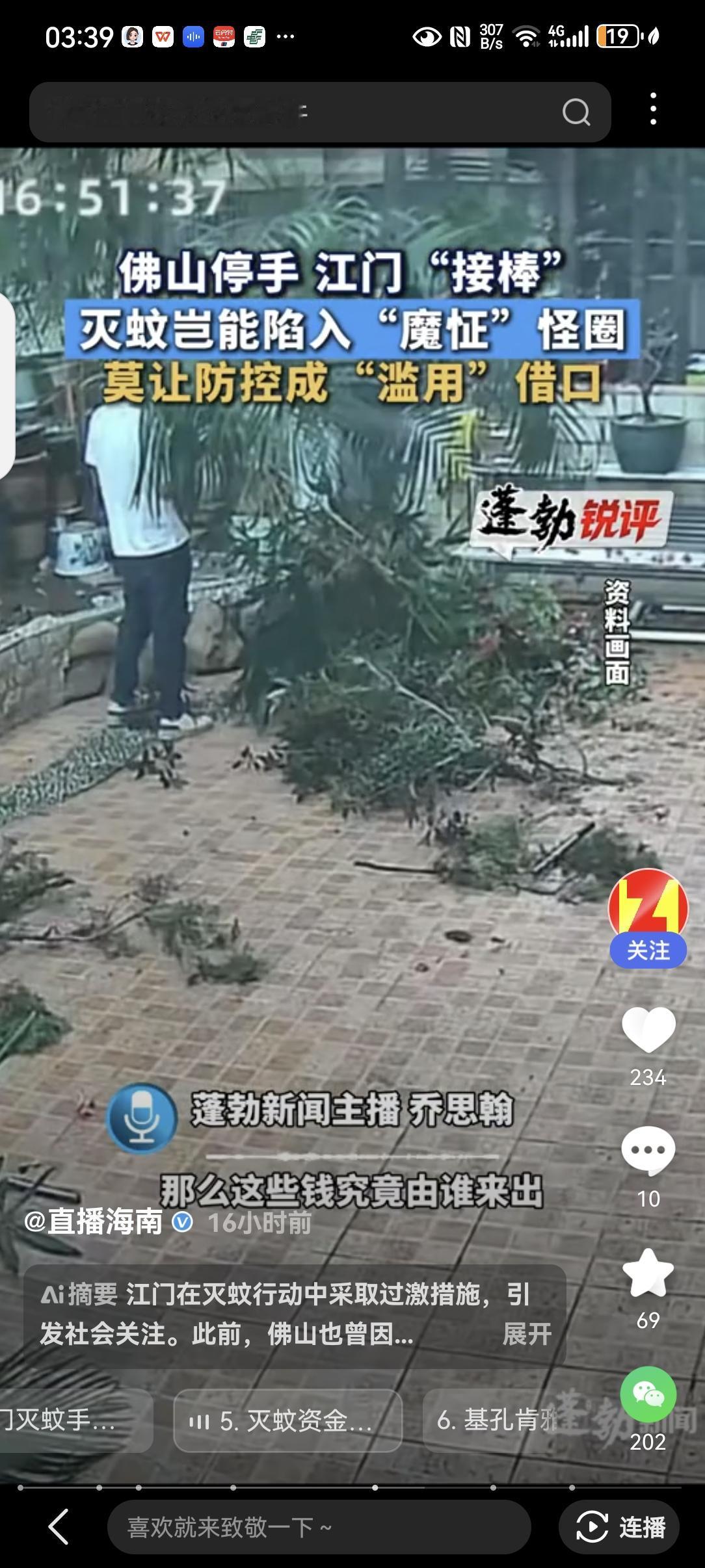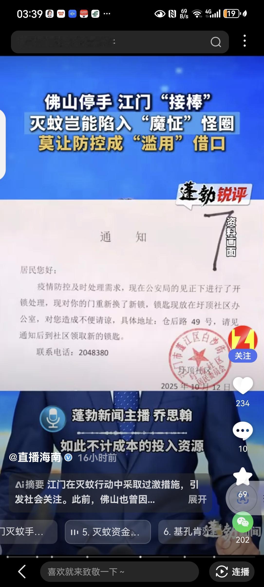 大家有没有关注到江门灭蚊的事?最近不少人在说,那边的灭蚊操作好像有点过头了,让人看着心里不是滋味。 之前佛山也搞过大规模灭蚊,当时就有居民反映,小区里到处喷药,蚊子是死了一些,可蜻蜓、蜘蛛这些吃蚊子的“天敌”也跟着遭了殃。 关键是珠江水系这个最大的蚊源没彻底治理好,从水里孵出来的蚊子飞到小区里,没了天敌制约,反而感觉比以前更多了,这让居民们挺无奈的。 后来佛山意识到问题,及时调整了做法,不再搞过度消杀,慢慢恢复了正常。本以为江门能吸取教训,没想到反而更极端了。 有居民说,工作人员直接闯进家里,把绿植搬出去消杀,甚至还有强制开锁的情况。大家都知道灭蚊是为了公共卫生,可这样做,不是侵犯了居民的隐私和财产吗? 而且每天用大型设备全程喷杀虫剂,看着就知道要花不少钱。这些钱到底是谁来承担?这么不计成本地投入,会不会造成资源浪费,是不是有点本末倒置了? 更让人担心的是,要是江门这边费劲灭蚊,隔壁佛山的蚊子又飞过来,那之前的功夫不就白下了?这账算下来真不划算。 还有个常识想跟大家说,登革热是一种自限性疾病,大多数患者就算不经过大规模灭蚊干预,好好休息也能自行康复。 其实灭蚊是好事,但得讲究方式方法。希望江门能冷静下来,别再用极端的办法,多学学科学精准的防控措施,既把蚊子控制住,也别让居民心里添堵。毕竟做事得考虑周全,不能只顾着眼前,不然最后反而容易出问题。