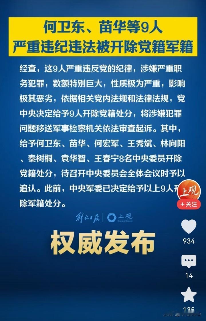 刮骨疗毒!9名高级将领因“严重违反党的纪律,涉嫌严重职务犯罪,数额特别巨大,性质极为严重,影响极其恶劣”,而遭到严肃查处! 这9人,身居很高的位置,按道理要有很高的素质,比如很强的主义信仰!不料,他们却早已败在了“糖衣炮弹”、金弹银弹面前! 还记得“九三阅兵”时的一句解说词,“当今世界,丛林法则抬头”,世界纷繁变幻,这时候,尤其需要强大的人民军队保家护国。 这些早已败在了“糖衣炮弹”、金弹银弹面前的将领,叫人怎么能、怎么敢信任呢? 比如说,海湾战争、伊拉克战争,美军就成功地用美元收买了敌方的高级将领! 经过此次刮骨疗毒后,人民军队更进一步锻造出风清气正、忠诚干净担当、堪当强军重任的高素质干部队伍!
