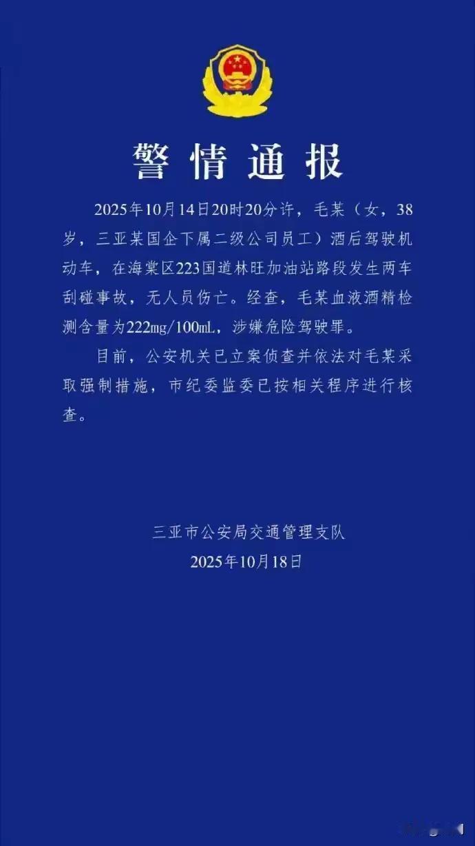 求锤得锤,女子酒驾撞劳斯莱斯后自称国企单位的,让市委来通报批评自己。事发10月14日,三亚市公安局交通管理支队发布警情通报:2025年10月14日20时20分,毛某(女,38岁,三亚某国企下属二级公司员工)酒后驾驶机动车,在海棠区223国道林旺加油站路段发生两车刮碰事故,无人员伤亡。经查,毛某血液酒精检测含量为222mg/100ml,涉嫌危险驾驶罪。 原来,这位女子酒后驾驶汽车时,将一辆劳斯莱斯撞坏,被劳斯莱斯车主拦住,随后警方赶来,其十分激动:称自己是国企单位的,这点小事不需要处理,让市委来通报。后来,经过查询毛某确实是国企员工,已涉嫌危险驾驶罪被拘留。 女子醉驾后撞劳斯莱斯阻碍警方检查
