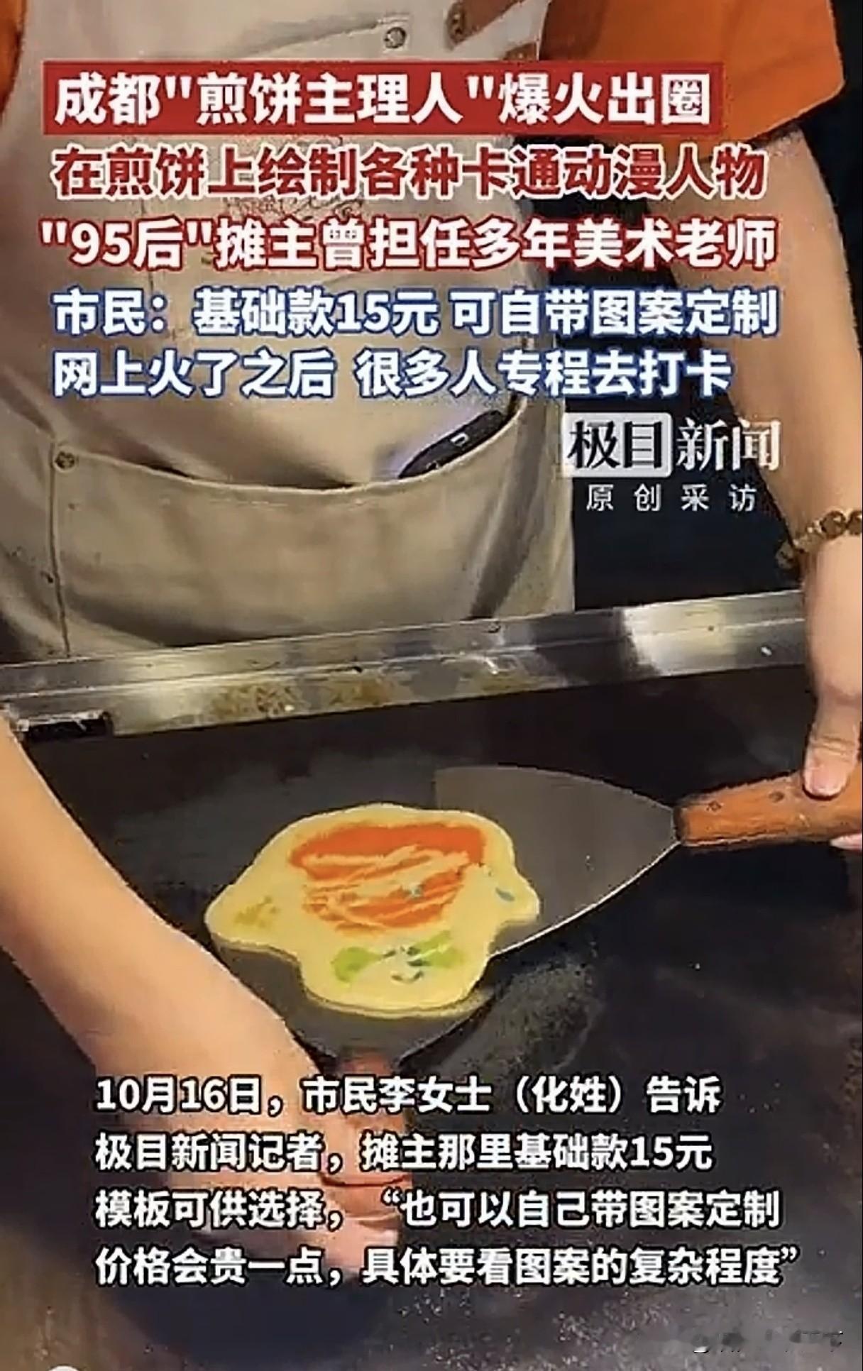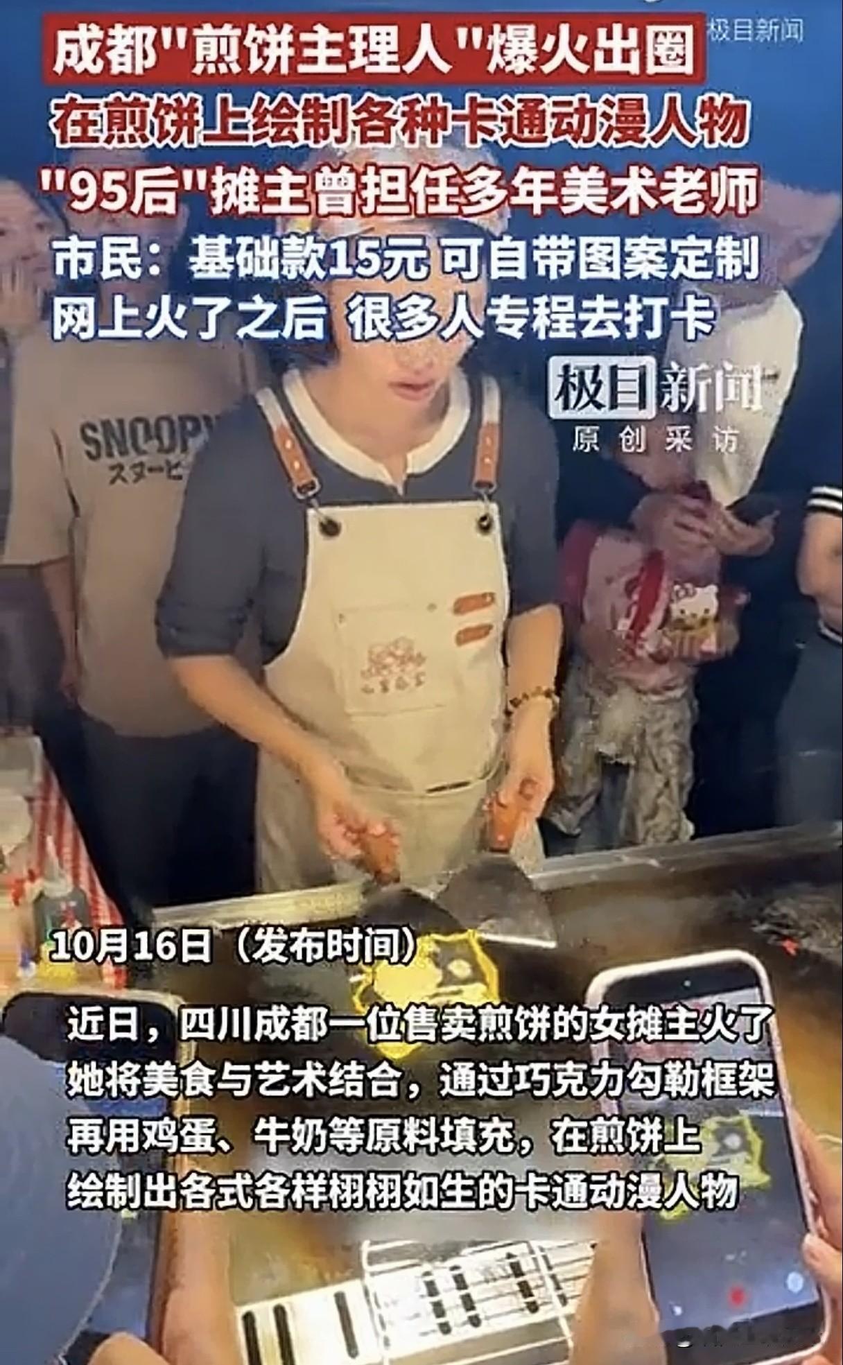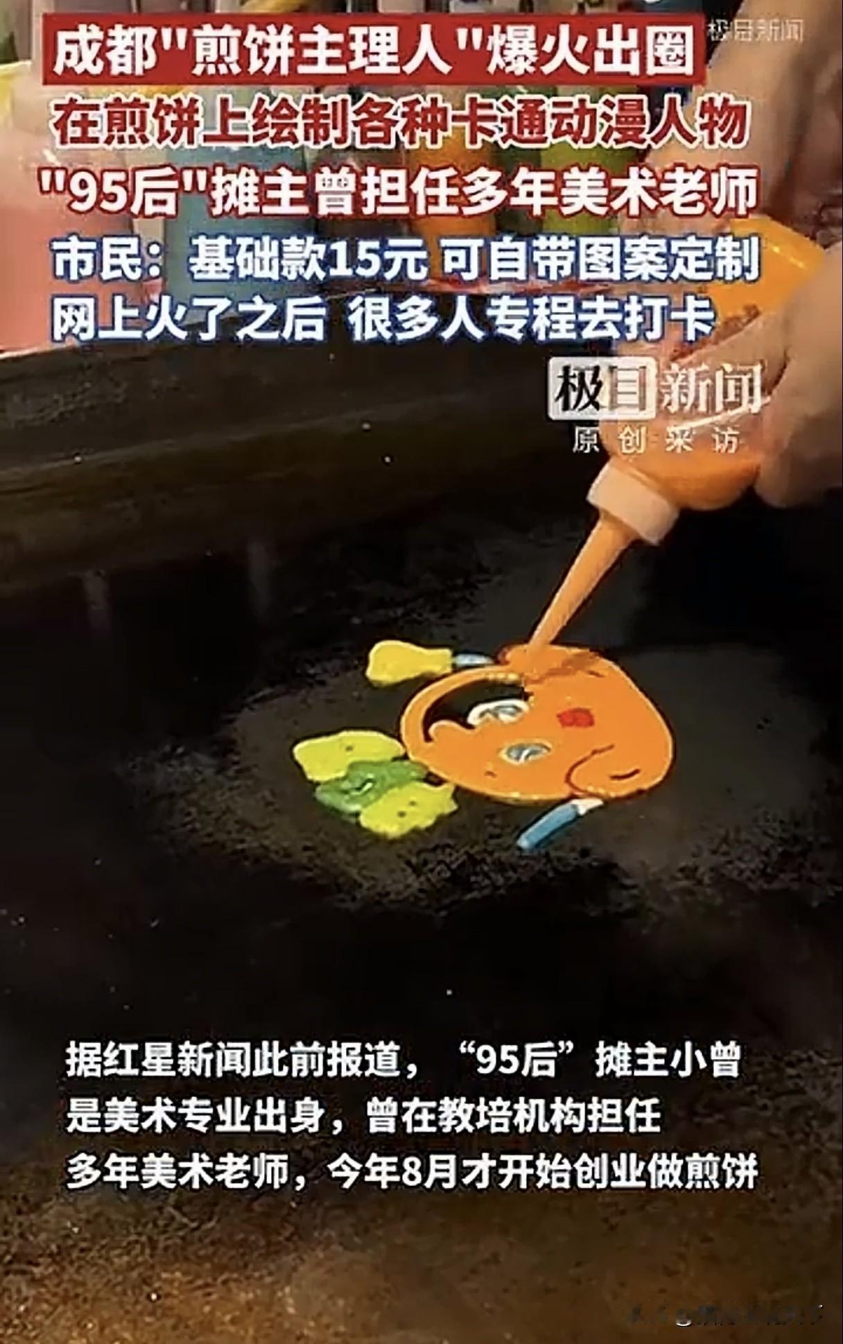 美术生就业新出路?美术老师摆摊卖煎饼,顾客把摊位围得水泄不通,看来只要思想不滑坡,摆摊也能赚大钱! 近日,成都一家可以绘制各种卡通图案的煎饼摊火了,“95后”女摊主也被称作“煎饼主理人”,众多游客纷纷前往抢购和打卡拍照。 据悉,“95后”女摊主以前做过多年的美术老师,今年8月才开始摆摊做煎饼的。 煎饼基础款是15元,价格也不算贵,定制图案收贵一点4,所以很是收顾客欢迎,特别是喜欢二次元文化的。 有网友表示:此时的清华美院: 老师:马上毕业了,你们都想干什么? 同学a:画煎饼 同学b:画煎饼 同学c:画煎饼 老师:你们为什么都要学你学姐呀? 也有网友表示:现在竞争太激烈了,好多摊煎饼的都在饼上画出各种图案,吸引顾客。有人画卡通人物,还有人画复杂的风景,可厉害啦。这也算把普通手艺玩出了新花样 还有网友表示:看来所有行业的毕业生最后的出路都是餐饮业啊。 不过也有网友泼冷水:这玩意怎么又火了 这都好几年之前的产物了 当时很火 然后没没多长时间就又全部倒闭了,现在又火了,真搞不懂。 除了图个新鲜感拍个照外,你还会去复购嘛?不知道大家对此事怎么看? 大学老师卖煎饼 煎饼摊主 美术生就业 手绘摆摊 美术老师创业