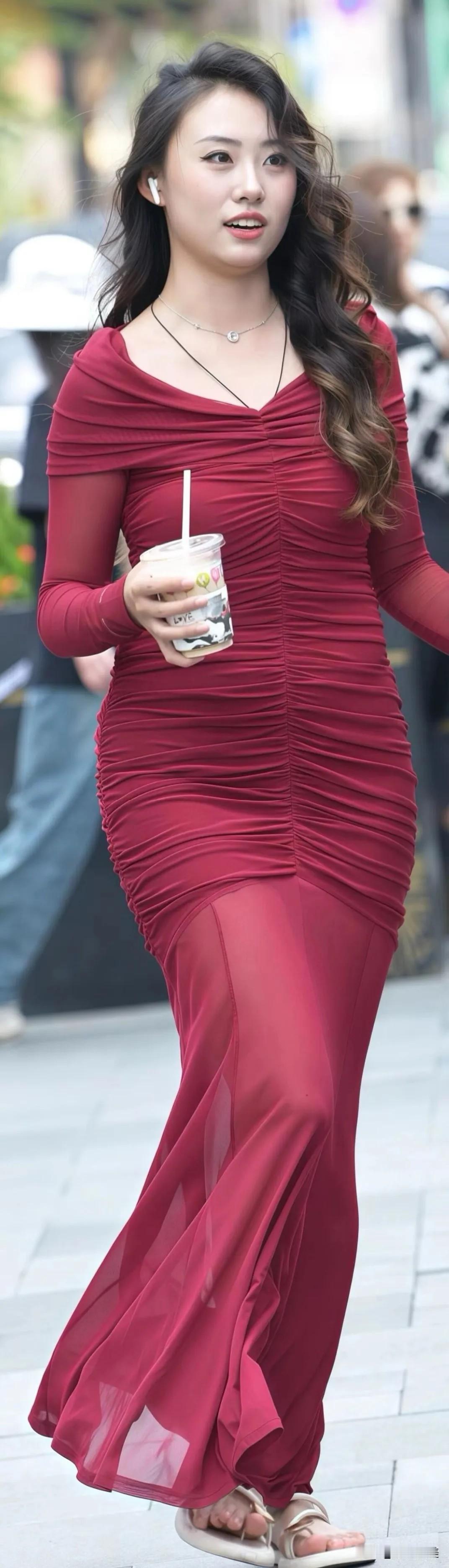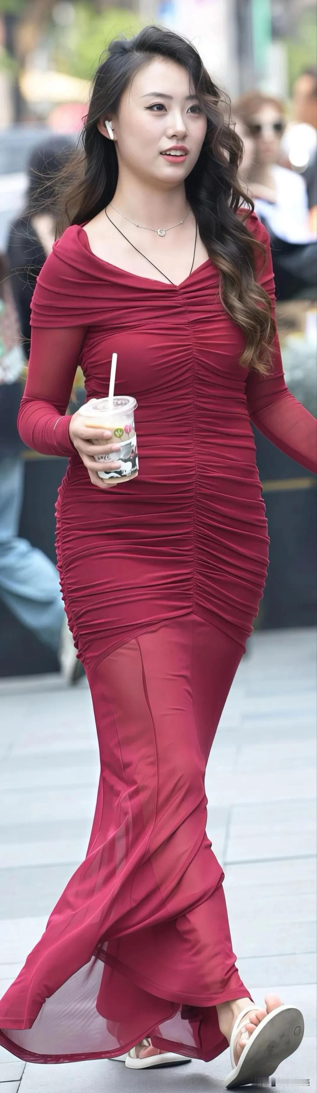 酒红色褶皱长裙!修身设计+网纱质感,行走间尽显优雅气质,搭配简约凉鞋,是街头的复