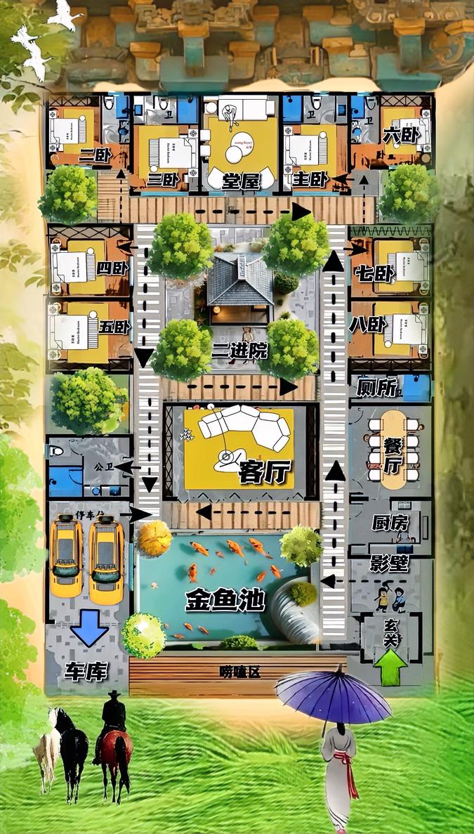 很好奇,合院也可做预制菜,706㎡整出八间卧室,差不多面积,二居室标准,放到哪都是无敌的存在! 按体量算,诚信十足。走过境界这条路,就抓瞎了,不说三代同堂,就是四代同堂住得下,典型卧室满满,生活质量不昨地! 所以说,四合小院被宿舍楼,附体了,只顾砌方格子,忘记设置娱乐功能! 要不是,一进院,又美又有灵气的金鱼池。和二进院,别改宋式风情。超大自建房真是,老家农村版的预制菜,不靠谱的八间房! 即然布局被卧室,干沉默了,三个挑空小地方,成四合院第二根救命稻草,盘活七个卧室的光和风,非要加个名头,定义为有灵魂的五进院! 总体着,布局很平凡,搭配高质量,动线很简单,两个洄游加暖廍,搭建出一亩半地大院子,就是一个典型的四合院! 居中堂屋,前有小广场,左手司厨,两个厕所做接应,是一个朴素的合院! 靠微缩的五进院,撑起的自建房,外形真好看,内部很拉垮! 如果你真的有一双智慧的眼睛,门口有伏笔,玄关加影壁的套装,是为上数不多的亮点! 暴论一,小门大院,才合理,布局比例又别有深意,这个门面小插曲!值得被喜欢! 有良心的合院,院与屋之间,你中有我,我中有你的关系!