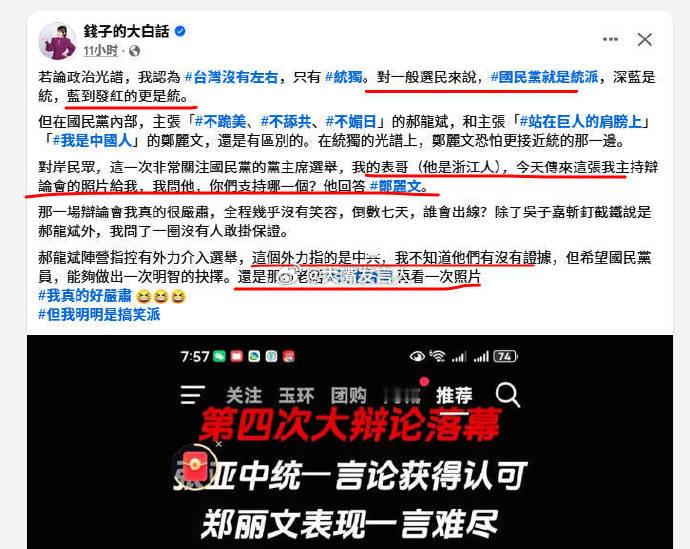吃人家的嘴短,拿人家的手软,钱子钱怡君,替黎少康主持周六周日两天的战情室,说话也是站在少康的立场上,少康挺郝龙斌,郝败选后,钱子的发文(图1),感觉阴阳怪气的[哈哈][哪吒嘟嘴] 新任中国国民党主席郑丽文