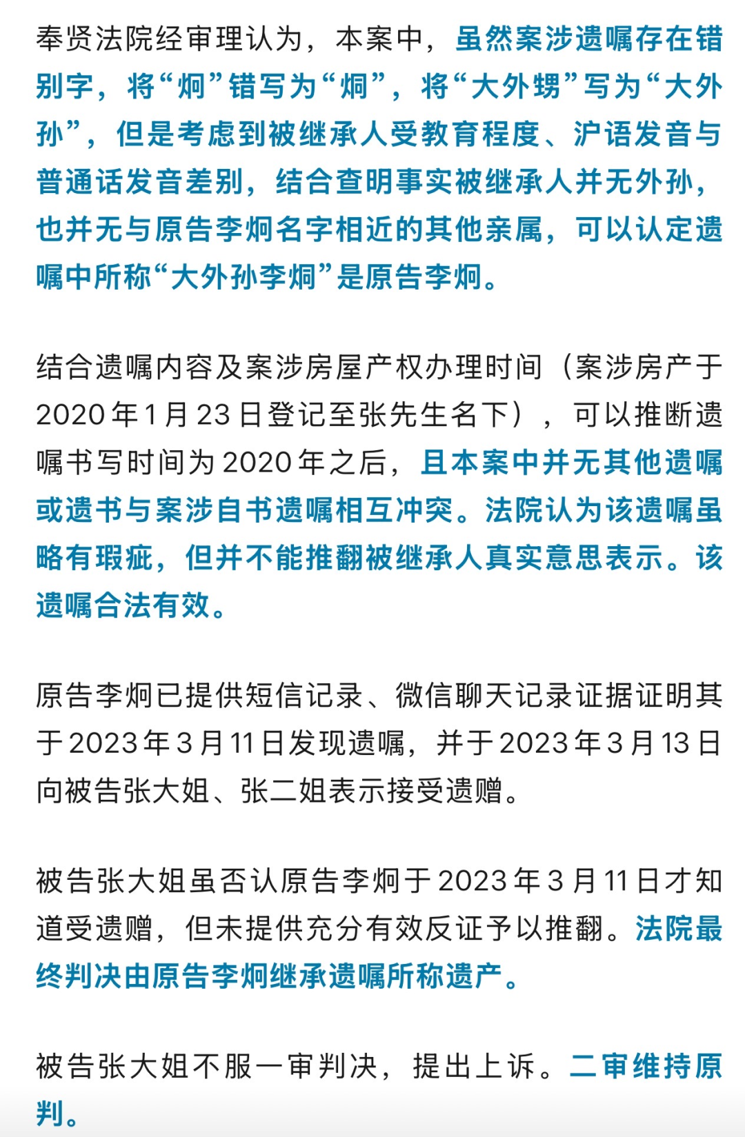 男子未婚未育将房子、存款全留给外甥,遗嘱却写错名字!法院:有瑕疵但合法有效