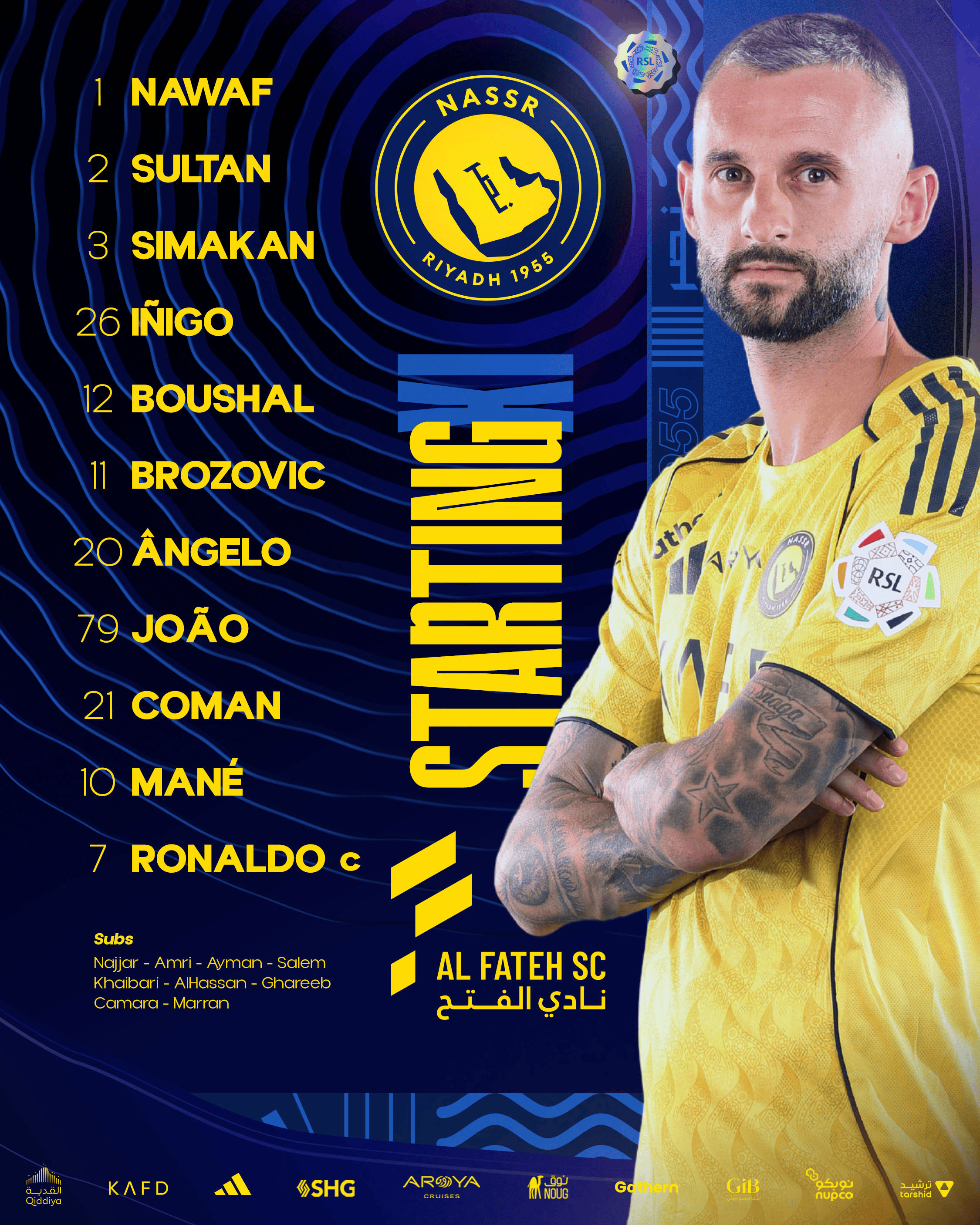 利雅得胜利首发:1-阿奇迪、2-加奈姆、3-西马坎、26-伊尼戈-马丁内斯、12-布歇尔、21-科曼、11-布罗佐维奇、20-安杰洛-博尔热斯、10-马内、7-C罗、79-菲利克斯