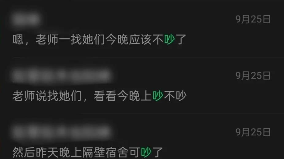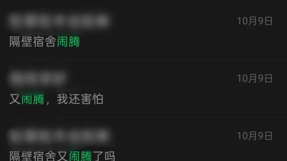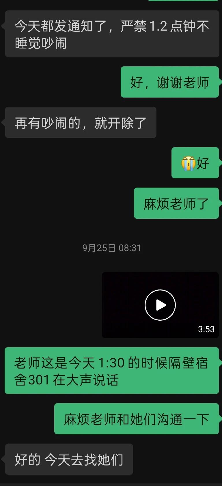 举报隔壁宿舍后被报复怎么办? 我们是考研寄宿宿舍,每个宿舍之间都不认识,我可以保证我们宿舍都特别安静,不管午休还是晚上十点半关灯后都是 1.隔壁宿舍的人不到11点半不去洗漱,去洗漱的路上还要在走廊唱歌,有时候半夜还唱戏曲真的很渗人(第二天我就直接把录音视频发给宿管了,宿管说她会去找她们,和我保证如果还在吵闹就让她们退宿舍) 2.半夜12点多用小音响在宿舍放歌唱歌,我去敲门告诉她们能不能小一点音乐,她们不唱了但依然放歌 3.昨天半夜11点多快十二点了,一直很吵在嘻嘻哈哈的,特别吵,我去敲了墙只安静了一秒?还是两秒,然后继续吵,白天的时候我去找了宿管,宿管还是说会去找她们 p2是我视频录音她们吵的时候,有发给宿管,p3是宿管和我保证再吵闹的宿舍会开除,其他的照片是我和我舍友的聊天记录,她们也都找过宿管但也没用 刚刚十几分钟前她们很大声的在宿舍说“隔壁的嘴真臭,就她们会敲墙是吧,以后我也敲”现在的情况就是隔一会她们就用东西特别用力的砸一下墙,我想问一下之后要怎么办啊?宿舍关系让人窒息的瞬间