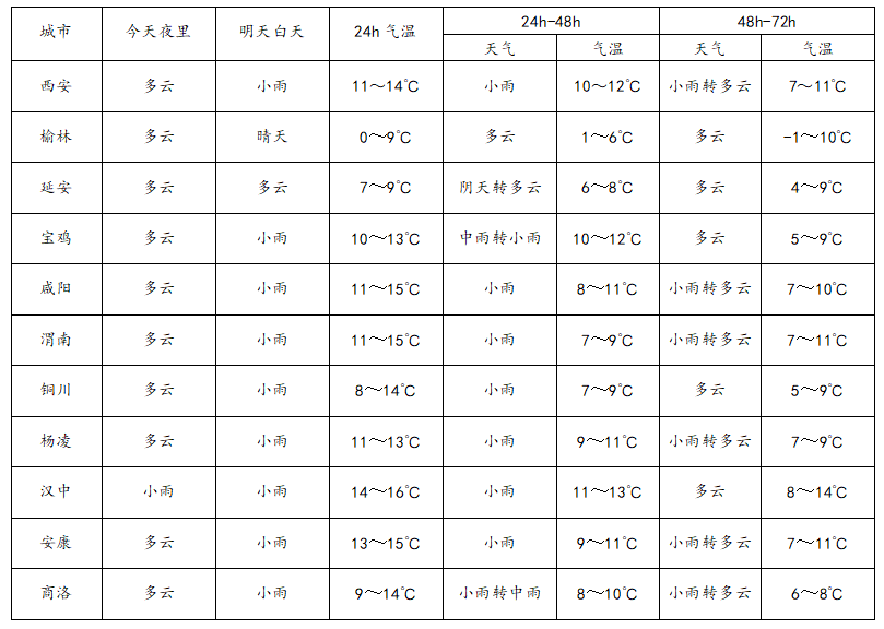全省阴天间多云。陕北南部部分地方有分散性小雨或阵雨(0.1~10毫米),关中大部有中雨(10~25毫米),西安西部局地、宝鸡局地和咸阳南部局地大雨(25~45毫米),陕南大部有小到中雨(5~20毫米)、商洛北部局地大雨(25~40mm),秦岭山区有雨夹雪或小雪(0.1~2毫米)。日平均气温关中大部、陕南大部下降2~4℃,关中东部和陕南东部局地下降6℃左右。陕北北部有霜冻。