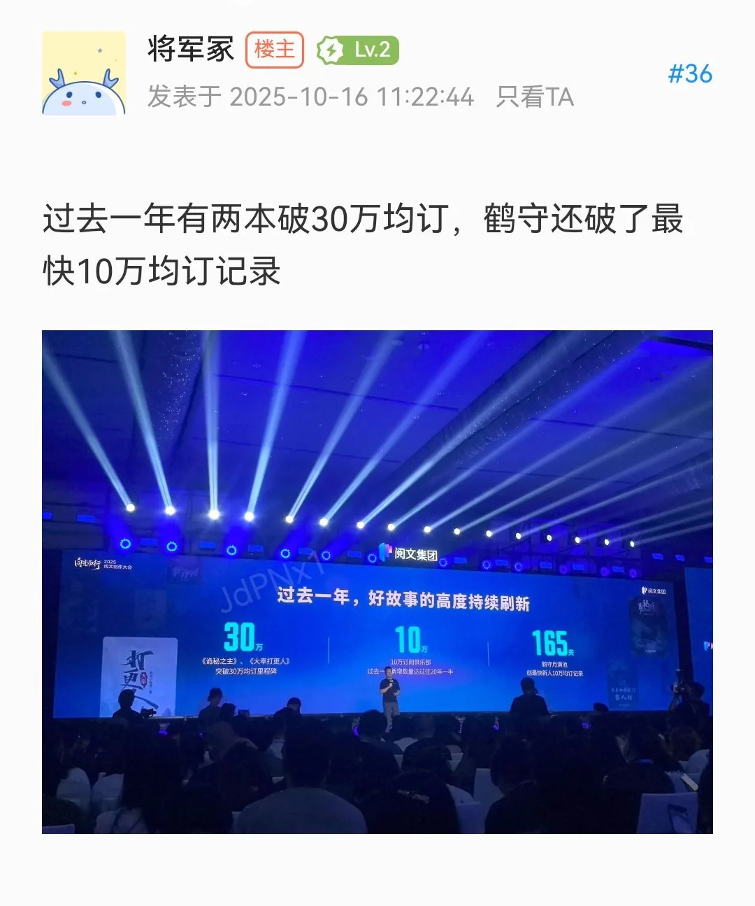 之前知道破十万均订也只是感叹了一声牛x,直到看到阅文创作大会上,明晃晃写着鹤守月满池只用了165天!破了最快新人十万均订记录!
