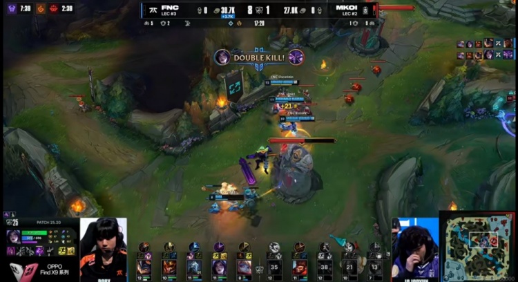 [8:44]双方各拿一只巢虫,FNC强开Alvaro巴德失败,Elyoya猴子反手配合Myrwn奎桑提留住了Razork皇子!不过回头Elyoya自己在河道送了回去!最终还是FNC拿到双虫!