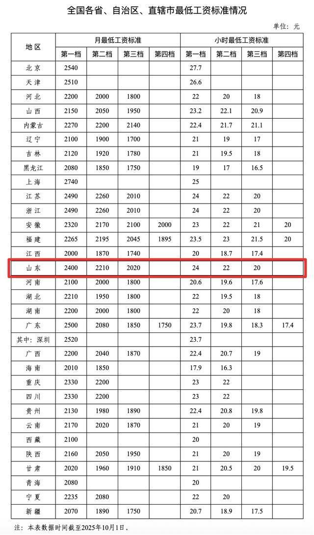 其中,山东省第一档月最低工资标准为2400元,第一档小时最低工资标准为24元。