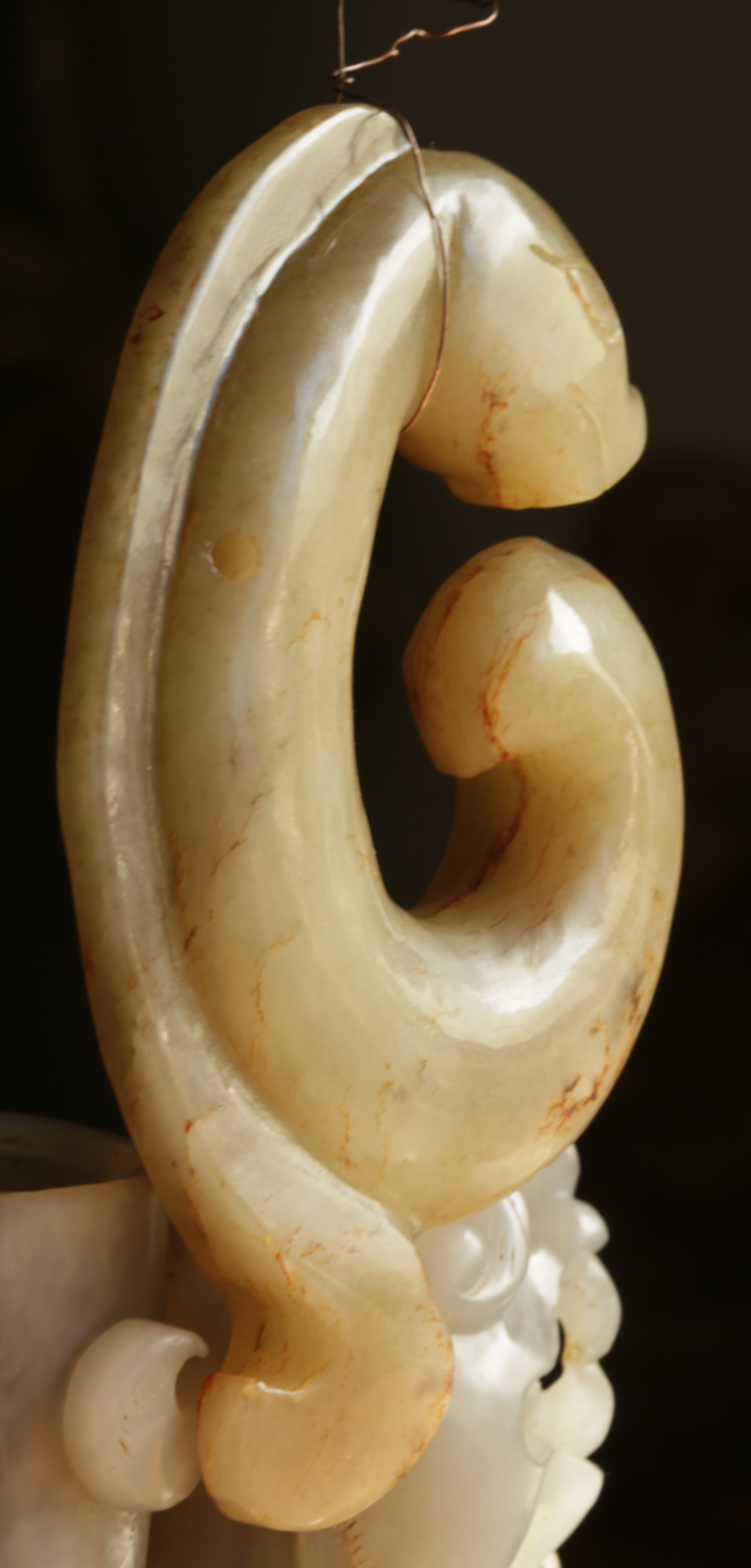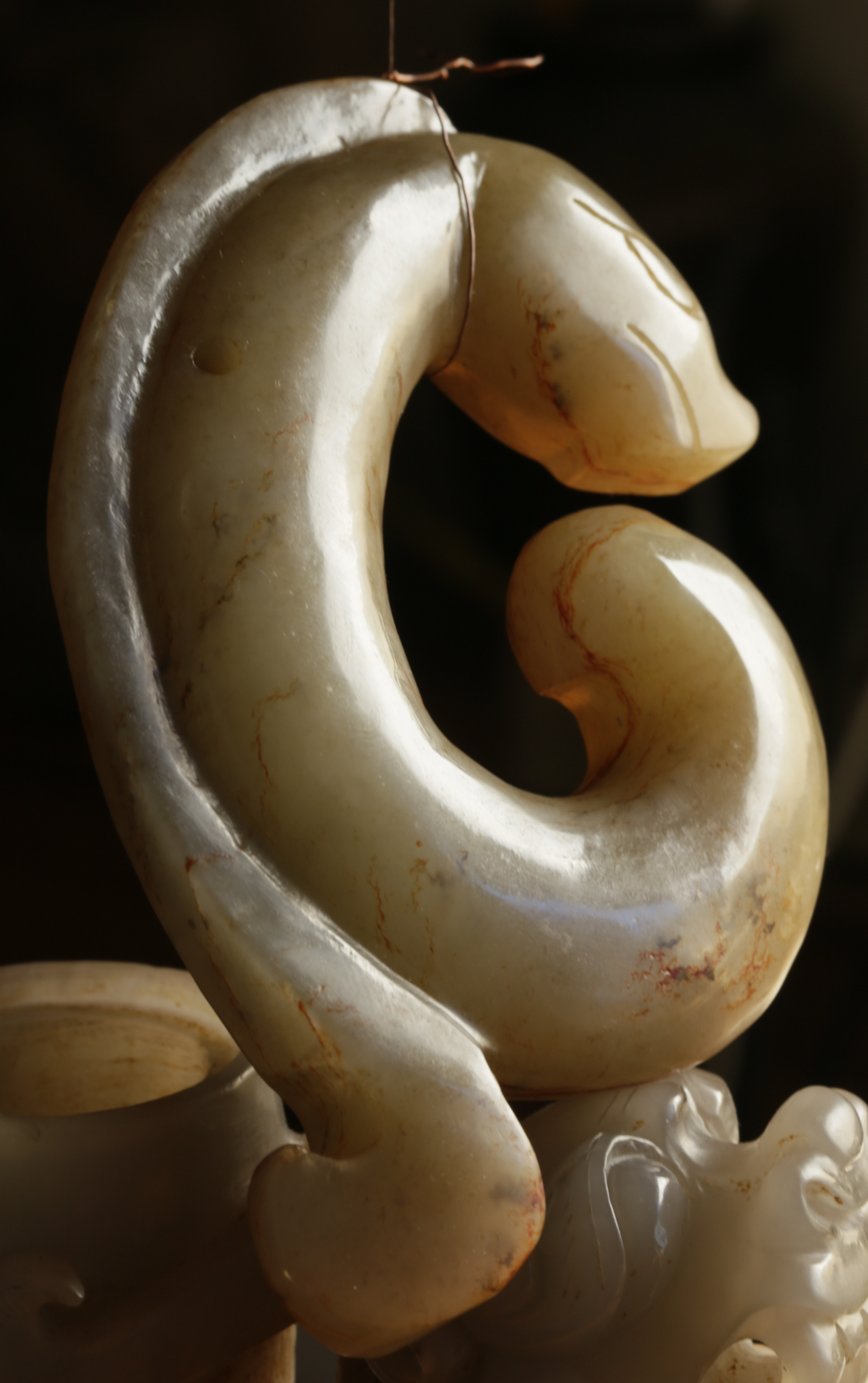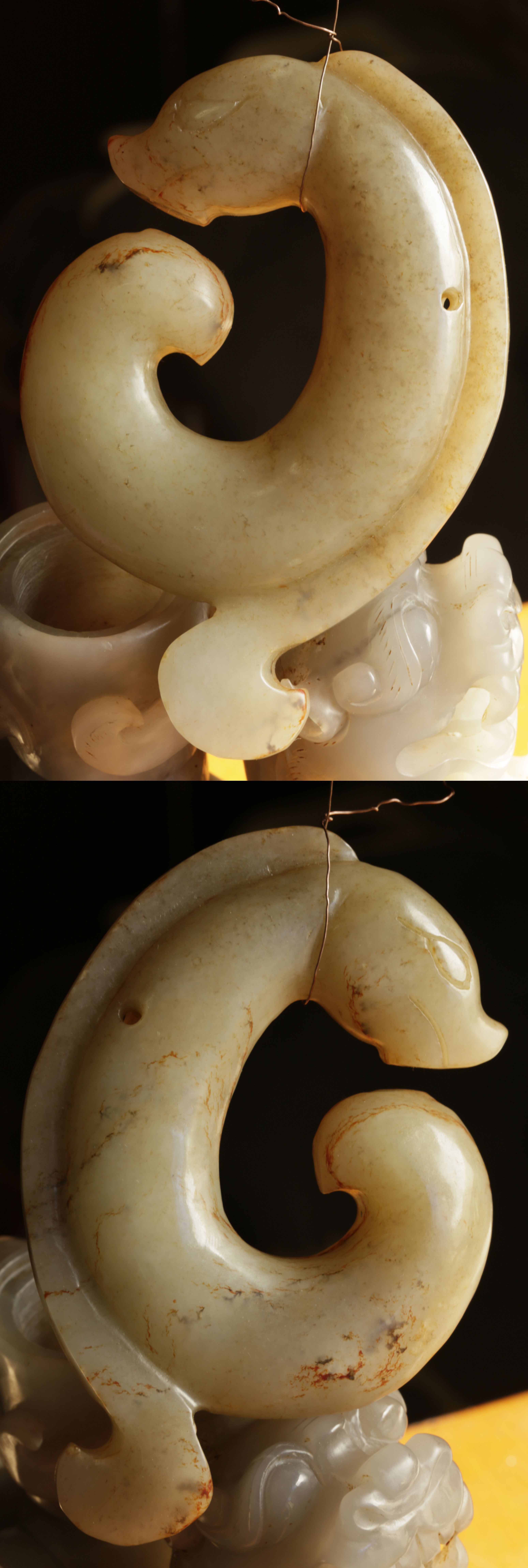 此类的红山文化“红山文化 . 白玉雕玉龙手把件”玉雕,珍贵而罕见。是不可多得的精品,具有极高的收藏价值。该玉能出和田玉鉴定证书!