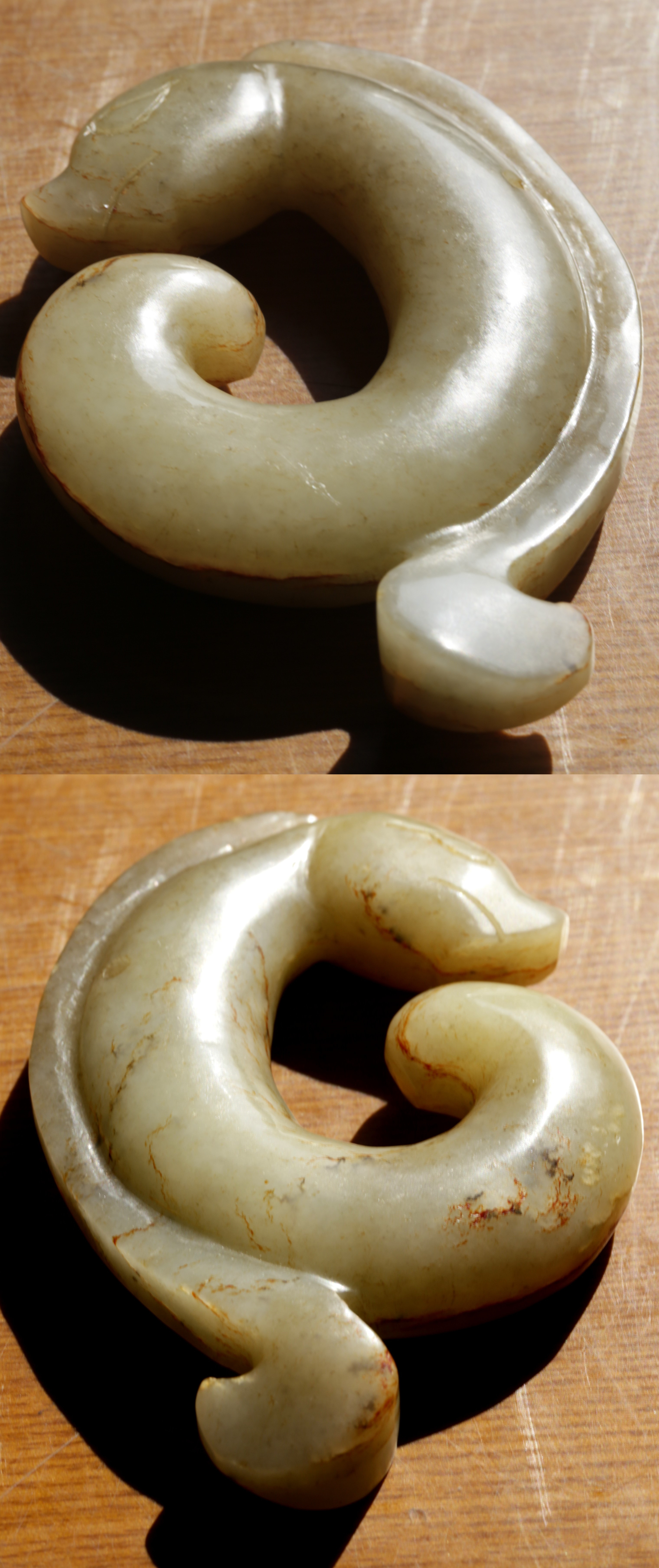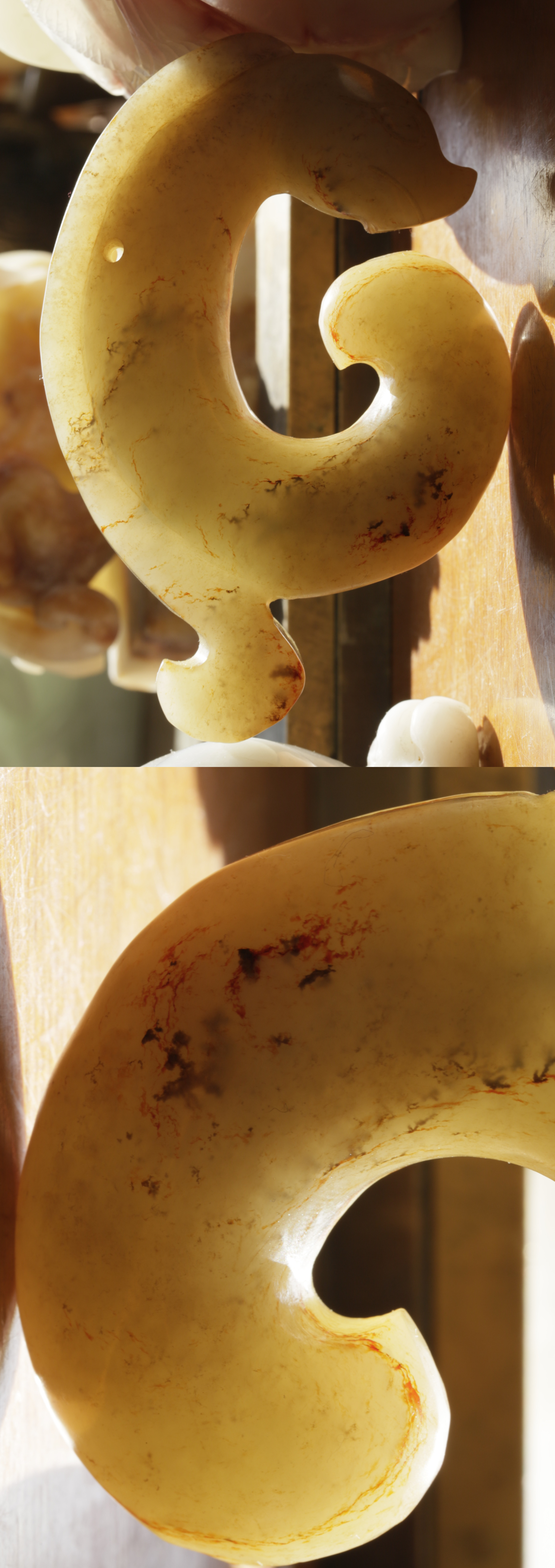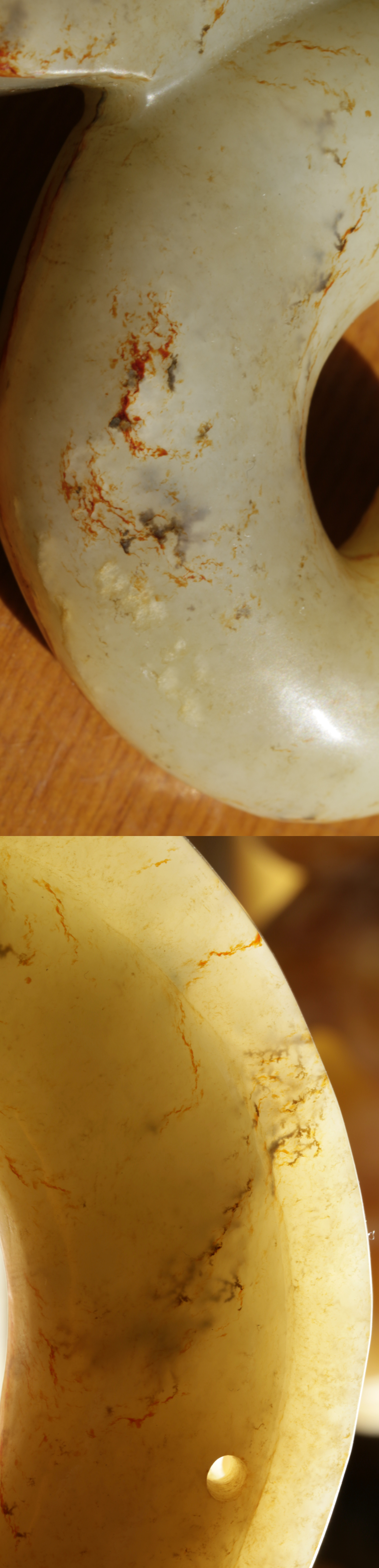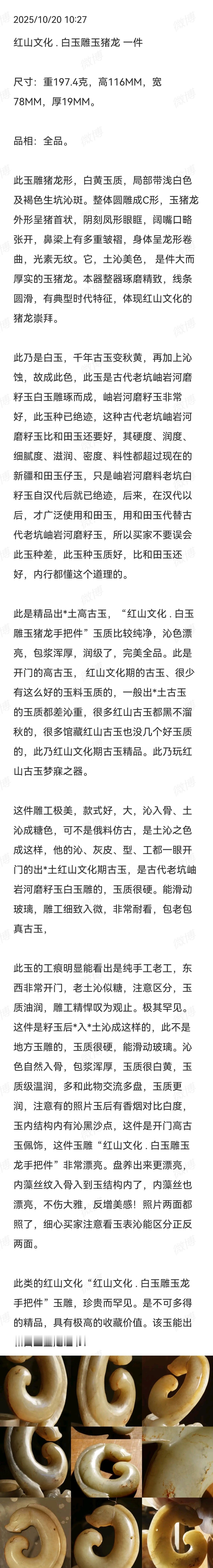 这件雕工极美,款式好,大,沁入骨、土沁成糖色,可不是俄料仿古,是土沁之色成这样,他的沁、灰皮、型、工都一眼开门的出*土红山文化期古玉,是古代老坑岫岩河磨籽玉白玉雕的,玉质很硬。能滑动玻璃,雕工细致入微,非常耐看,包老包真古玉,