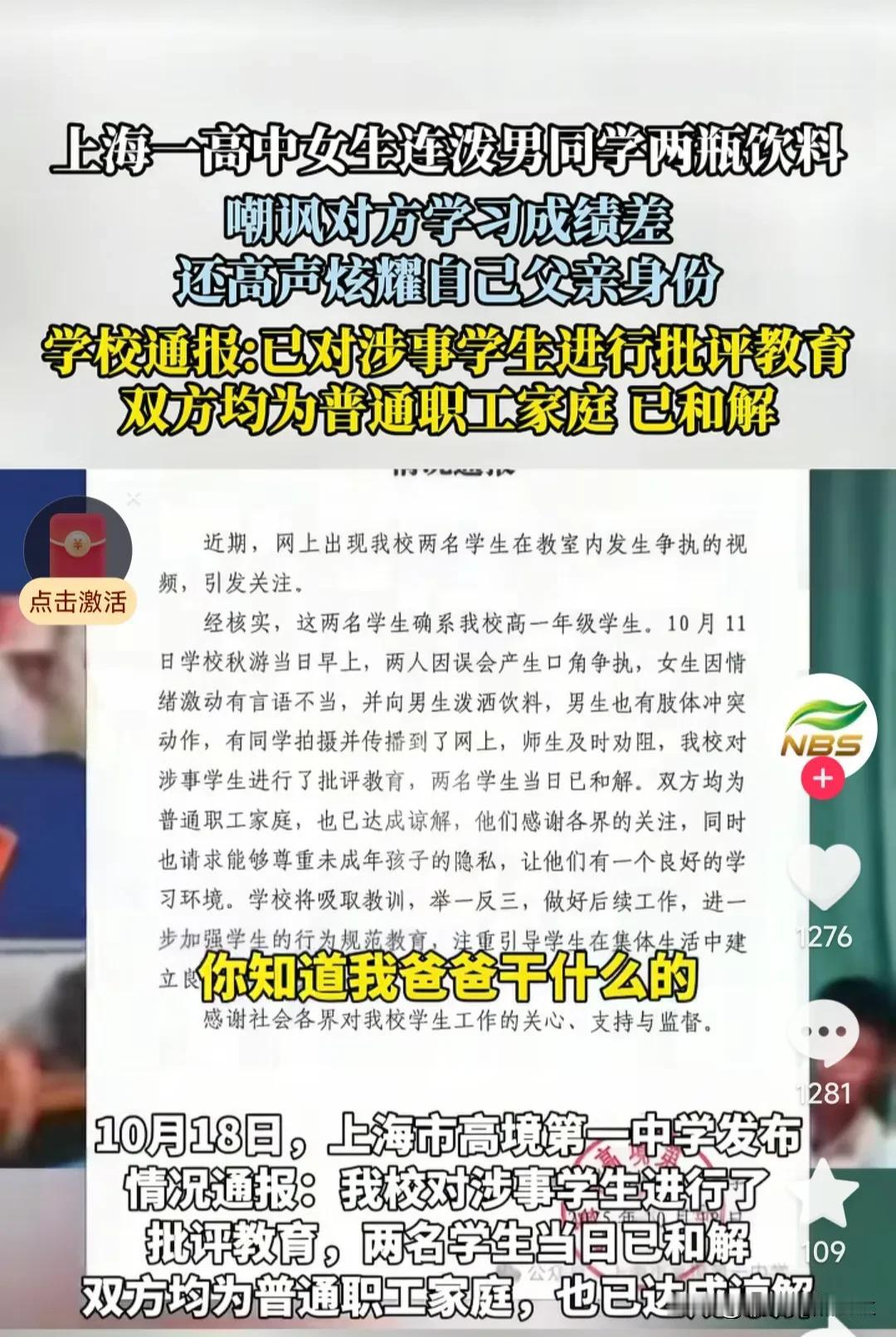 “知道我爸是谁吗?”普通家庭的孩子真说不出这牛逼的话,校方已通告处罚结果,父亲身份存疑,网友不买账。 上海某高中教室内,一名女同学与男同学发生矛盾,女生两次向男生泼饮料挑衅,言行之间将优越感展现得淋漓尽致,一般人没这感觉。 先是瞧不起男生成绩,比他高30分进入高校,也成为她炫耀的资本,认为男生以后就是大专生的料,将饮料泼向男生身上,并叫嚣道,“我告诉你,像你这种中专,大专生有资格和我说话吗?” 男生未反击,默默擦去饮料,直接无视。然而这行为又激起了女生的斗志,再次将饮料泼向男生,朝男生喊道,“你知道我爸是谁吗?” 事态升级,男生反击,起身将女孩锁喉,班上男同学赶紧上前将女生拉开。 看来这位女生的优越感在班中很显眼,男生被欺负不会是这一次。女生两次向男生泼饮料没有同学制止,一开始反击就被人拉开,而且有人认为是拉偏架,这个班级班风有问题。 当一个女生作为弱者主动挑衅男生,一方面是她没脑子,另一方面是她背后有家庭背景支撑。 能嚣张地向同学泼饮料,说明该女生缺教养,能脱口而出搬出她爸爸,说明她爸爸大小都是个官,手中有点权,否则没这牛逼。 又一个“我爸是李刚”,大家都想知道这个“李刚”又是谁? 10月18日,校方通告男女双方父母都是普通职工,已经达成谅解,学校对涉事学生进行了批评教育。 到底怎样的才算普通职工,孩子的言行骗不了人,这不是一般人能模仿得来的。 当着全班同学连泼两瓶饮料,并且当众羞辱,这等委屈任何人和父母都不会谅解,不知是哪一方有手腕。 正是一次次被“和谐”,坏人还是会坏,还会认为自己的言行没错,总有人会为她兜底。受欺负的孩子更自卑,学会硬刚不行,接受现实的残酷。 通过这件事可以发现,那些原本存在于成人世界的价值观已渗透进了学校,教育部门应引起重视,特别是对学生一定要公平。 从女生身上看到了父母的为人处世,即对孩子教育的失败。人立于世得懂得谦虚和尊重他人,路才越走越宽。人狂必招祸,人前炫必招嫉妒,不尊重他人也是作贱自己。