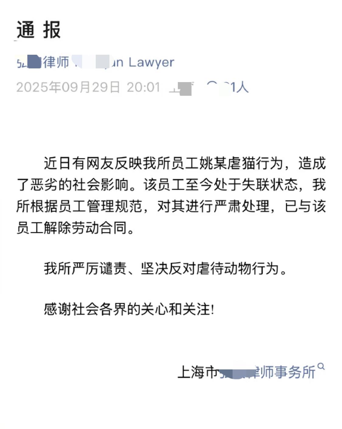 上海律师界出了个“名人” 不是因为官司打赢了,也不是因为薪资待遇太高了!而是这个名叫姚远的律师在外网的视频平台发了一些虐猫视频,引发网友的一系列反感! 从2017年开始的8年时间里,制作了300多条虐猫视频,数量多达4000多只,平均每条视频基本虐猫2到10只不等,视频内容及其残暴残忍,让不少网友纷纷愤慨不已! 也有网友调侃,这可能比当年的南京大屠杀更加残忍,虽然对象是动物,可这也太让人糟心了! 上海律所也对姚某造成的社会影响做出通报回应,已经解除与该律师的劳动合同!只是目前姚某处于失联状态,只能通过通报回应情况! 对于姚远这样的行为,仅仅是解除合同,感觉并未有任何影响,他依然可以依靠视频谋取暴利!这样貌斯斯文文的高材生,为何会有这般不齿的行径,真是大家都无法理解,大家觉得该如何解决姚某这样的行为,才可以防止更多动物被伤害呢? 姚远 保护动物