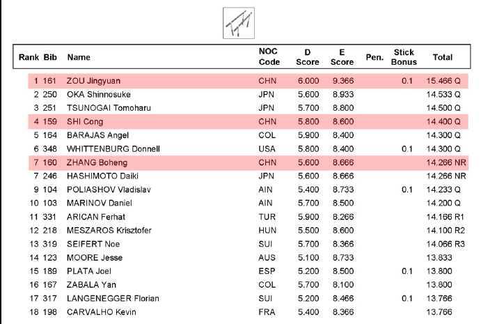 另外一位中国选手侍聪以总分14.4分,排名第四,同样进入决赛。张博恒14.266分排名第七,但队内排名第三无缘晋级。