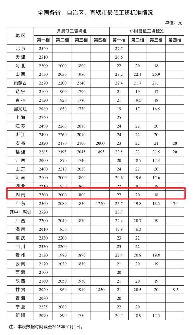 数据显示,湖南第一档月最低工资标准为2200元,第一档小时最低工资标准为22元。