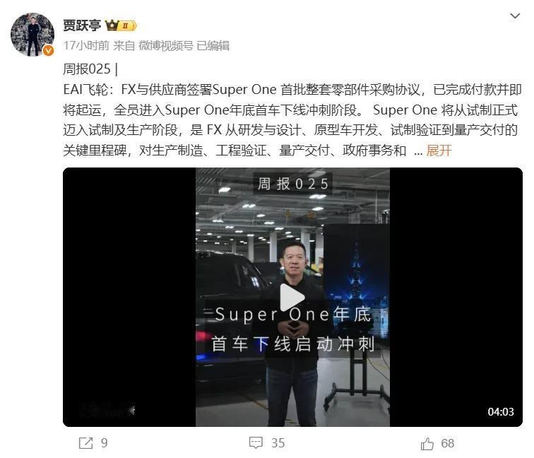 开始冲了!贾跃亭宣布大消息,法拉第未来第二款车super one的生产交付达成重大里程碑,法拉第已经同供应商签署首批整套零部件采购协议,而且已完成付款并即将启运。在此基础上,贾跃亭高呼,法拉第全员进入super one年底首车下线冲刺阶段。 说白了就是,贾跃亭的第二辆车已经买好了零件,供应商准备发货到工厂,力争年底前造出第一辆车出来。对国内车企不值一提的进度,贾老板看来则截然不同,每一步都很重要,别人可以不在意,自己不能不说。尤其是自从两个月前,super one刚一发布就收获10000多台付费订单后,贾跃亭一直憋着一口气。 关键是这款车当初被发现同长城旗下魏牌高山一模一样,一度被认为是山寨长城。不过很快被证实错怪贾老板了,原来这是长城老板魏建军的“曲线入美”战略,借贾跃亭的手把汽车卖到美国,贾老板和魏老板各取所需,都是生意。 目前看来,有了长城的支持,贾跃亭在年底前实现第二款车的量产,可能性确实很大。再加上只卖8万美元,比起第一款车FF91的30.9万美元低了不止一点半点。这对富裕的美国人而言就是贵一点的玩具,这么拉风的车量产后大卖,还真不是天方夜谭,希望贾跃亭能成功。