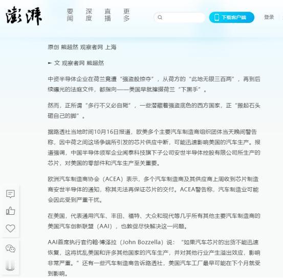 路透社:荷兰对中国芯片公司偷袭将很快严重影响美国汽车业。   据路透社当地时间10月16日报道,欧美多个主要汽车制造商组织团体当天晚间警告称,因中荷之间这场争端所引发的芯片供应中断,可能迅速影响美国的汽车生产。报道强调,中国半导体领军企业闻泰科技旗下子公司安世半导体控股有限公司所生产的芯片,对美国的零部件和汽车生产至关重要。   今年9月底,荷兰在美国的指使下,突然对安世半导体动手了。他们以所谓的"国家安全"为由,冻结了这家公司的全球资产,还把中方管理层给停职了。荷兰人以为这样就能卡住中国的脖子,没想到却把自己坑进了泥潭。   安世半导体是全球汽车芯片市场的重要玩家,特别是在功率半导体和模拟芯片领域。这些芯片虽然看起来不起眼,但却是汽车电子系统的核心部件。   一辆现代汽车需要数百个电子控制单元,从发动机管理到安全气囊,从车窗控制到充电系统,都离不开这些芯片。安世半导体在分立器件和逻辑芯片领域占据全球重要市场份额,其产品广泛应用于汽车、工业控制、消费电子等领域。   然而荷兰政府的这一行为却引发了连锁反应,中国政府迅速采取反制措施,禁止安世半导体在中国境内的子公司及分包商出口特定成品元器件和组件。   这一措施直击安世半导体的供应链命脉,因为该公司70%的产能都在中国。安世半导体在中国拥有重要的生产基地和研发中心,许多关键产品在中国制造。当中国禁止出口时,全球客户的供应立即受到威胁。   美国汽车制造商首当其冲受到影响,代表通用汽车、丰田、福特、大众、现代等几乎所有主要汽车制造商的美国汽车创新联盟发出紧急警告,如果安世半导体的芯片供应中断无法迅速解决,美国汽车工厂最早可能在11月受到影响。这意味着留给各方解决问题的窗口期只有几周。   汽车制造商通常保持几周到几个月不等的库存,但安世半导体的芯片供应中断可能导致库存迅速耗尽。2021年全球芯片短缺导致数百万辆汽车减产,造成数千亿美元损失。这次危机虽然目前仅涉及一家供应商,但其政治性质意味着解决难度可能更大。   更糟糕的是安世半导体的芯片很难在短期内找到替代方案。这些芯片的供应商相对集中,安世半导体在某些细分领域占据主导地位。汽车制造商需要重新评估供应商的地理分布、股权结构、生产布局,试图降低单点故障和政治风险。但这种重构需要时间和巨额投资,在过渡期内,产业链的脆弱性将长期存在。   显然荷兰政府的行为也引发了国际社会的广泛关注,中国商务部多次表态强调,闻泰科技2019年以约29亿欧元收购安世半导体是一笔合法的商业交易,收购获得了当时所有相关国家监管机构的批准。荷兰政府的行为是对市场原则和契约精神的严重破坏。   荷兰经济事务大臣表示将与中国官员会面讨论解决方案,但外界对达成突破性进展并不乐观。这场危机可能的结局有几种:一是各方达成某种妥协,允许安世在特定条件下恢复运营;二是安世事实上分裂为独立运营的中国部分和荷兰部分;三是公司被迫出售给非中资买家,中国投资者承担巨额损失。   无论哪种结局,全球汽车产业都需要为供应链的深度重构做准备。地缘政治已经成为供应链设计中必须考虑的首要因素,而不仅仅是成本、效率和质量。汽车制造商正在重新评估供应商的地理分布、股权结构、生产布局,试图降低单点故障和政治风险。但这种重构需要时间和巨额投资,在过渡期内,产业链的脆弱性将长期存在。   荷兰政府的这次偷袭行动,不仅没有达到预期的效果,反而让自己陷入了尴尬的境地。美国汽车业面临着生产中断的风险,而荷兰则可能失去一个重要的经济合作伙伴。这场危机也再次提醒我们,在全球化时代,任何国家都不能孤立地看待经济问题,合作共赢才是解决问题的正确途径。   来源:澎湃新闻