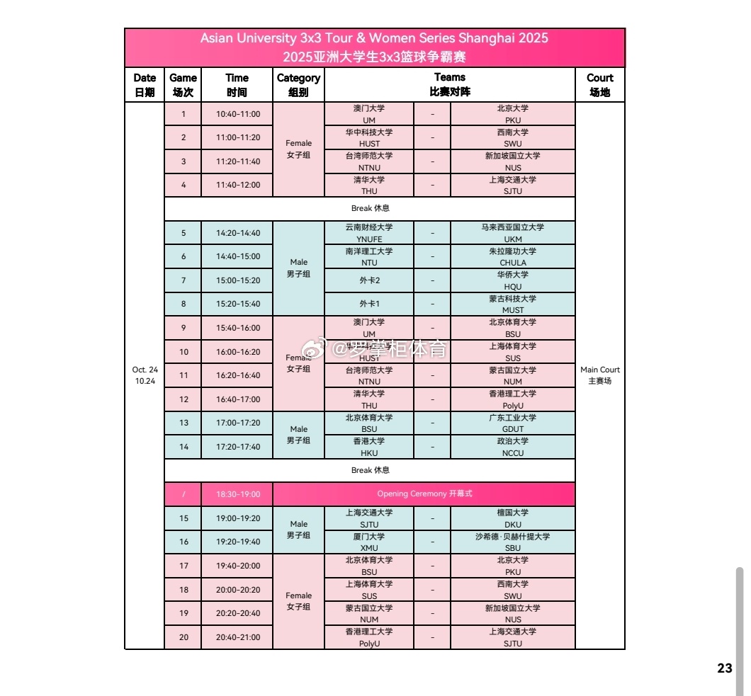 本届亚洲大学生三人篮球争霸赛落的赛程和代表球队名单,我们中国的大学生能不能拿下这次的亚洲冠军?亚洲大学生三人篮球争霸赛落地上海篮球CUBA