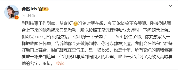 时间凝炼在空气里,是一场bo5,也是十年。所有交织的情绪包裹着他一路走到这里,他的眼泪蔓延到周围人的心里,他也一定听到了无数人高喊着他的名字,Bdd。”