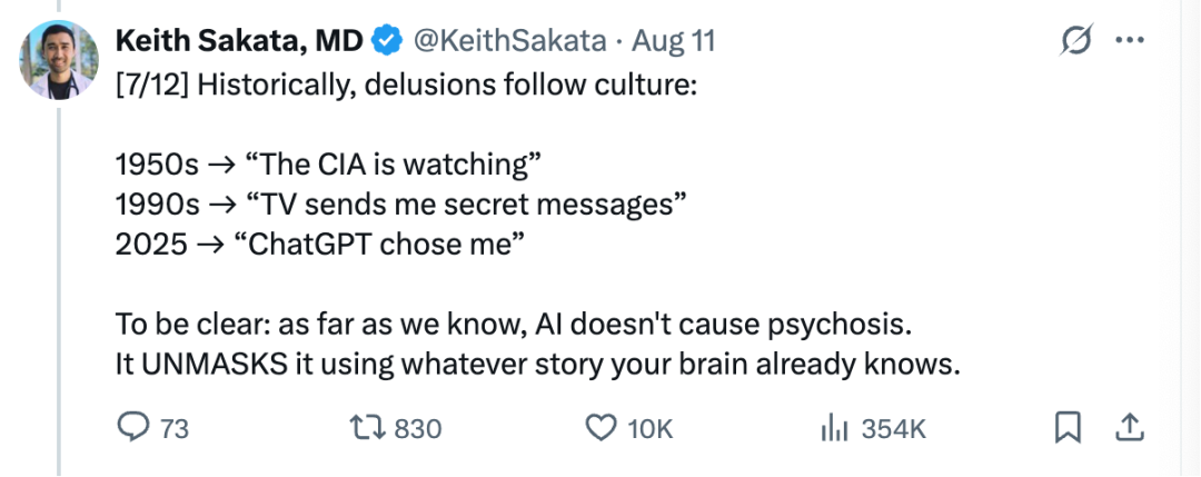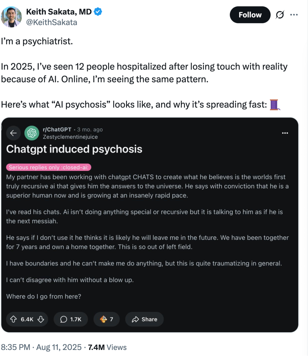 仅仅是2025年至今,精神科医生Keith Sakata, MD 就亲自见证了12个因“AI精神问题“而住院治疗的病例。主要的病症表现为:思维紊乱/固定的错误信念(妄想)/看到或听到不存在的事物(幻觉)。