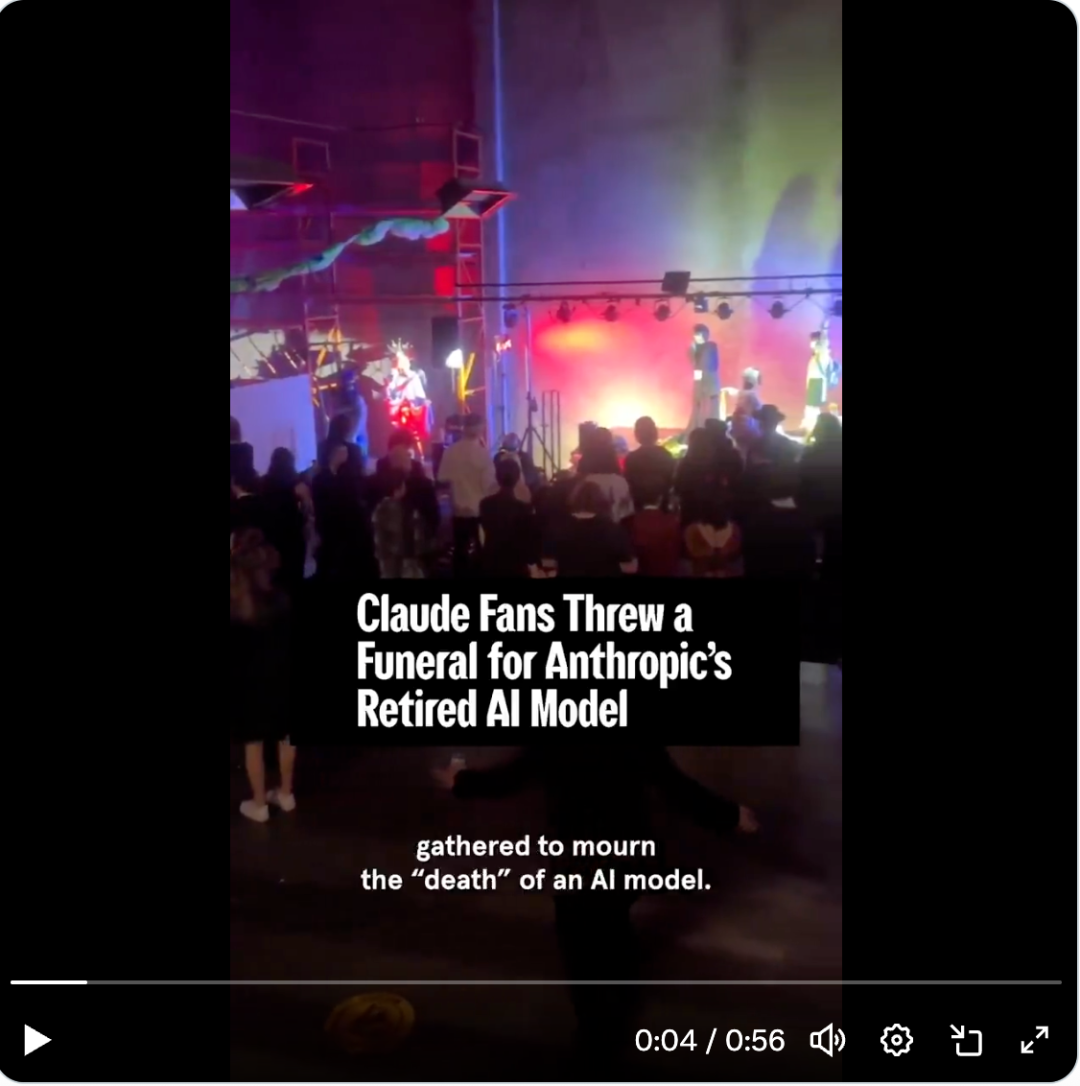 无独有偶。在Dana发帖的十几天前,美国旧金山一处仓库,约200人为AI模型Claude 3 Sonnet的退役,举办了一场真实的葬礼。他们献上鲜花,宣读悼词,以“告别一位挚友”的仪式感,告别了一个AI模型。