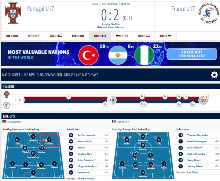 1、2002年,U17欧洲杯,葡萄牙U170-2法国U17(2黄变1红)
