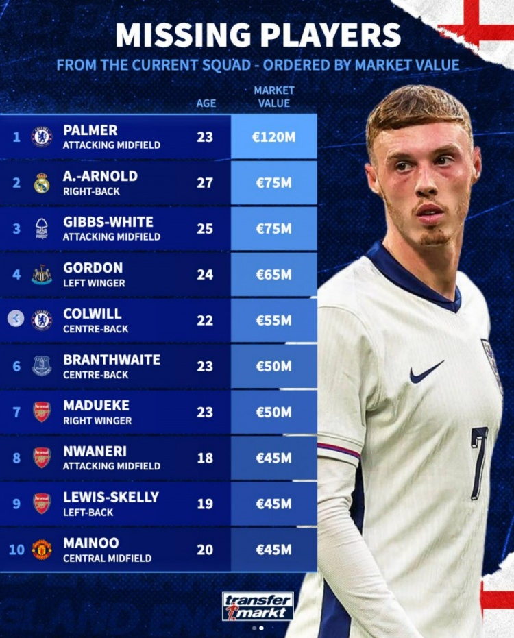 直播吧11月17日讯德转盘点了缺席本期英格兰名单球员身价榜,具体如下: