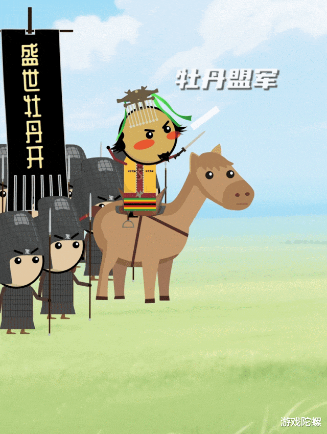 甚至偶尔我们还能看到一些幽默小动画。比如最近那个盛世牡丹开盟主“幽灵王”在官渡整活的小动画,就做得颇为逗趣。用这种抽象画风去表达三国战场上的趣味玩家故事,看得出官方也是非常玩得开了。