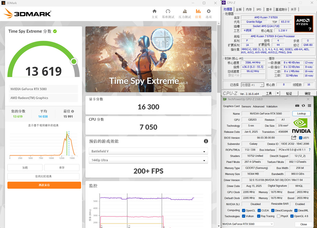 RTX5080核心为GB203架构,5nm工艺。拥有流处理器10752个,112个光栅单元,336个纹理单元,默认频率2295MHz,BOOST频率2655MHz。显卡位宽256Bit,显存为GDDR7,显存容量16GB,显存等效频率30000MHz。