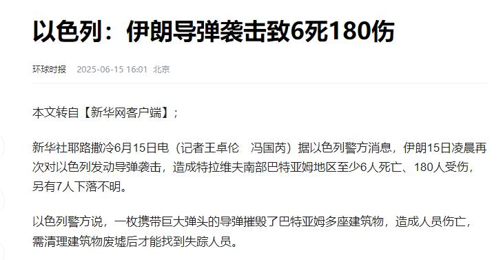 以色列出现了重大伤亡,当地时间15号那天,伊朗导弹密集的砸进以色列地界,现在算下来已经8个人死亡,200多人受伤。 巴特亚姆那边损失最重,6人丧生、180人受伤,还有7人被埋在废墟里生死未卜。 伤亡这么惨,直接原因是伊朗砸过来的导弹雨,但以色列人过度迷信‘铁穹万能’,也是让悲剧放大的关键。 长期以来,以色列凭借先进的军事技术,构建起了一套看似坚不可摧的防空体系,如“箭式”防空系统、大名鼎鼎的“铁穹”拦截系统等。 部分老百姓可能真觉得警报响了也不用慌,甚至懒得钻进防空洞躲避,结果这次吃了大亏。 然而,他们低估了伊朗复仇的决心,伊朗数十枚乃至上百枚导弹全飞过来了,从伊朗发射场到以色列城市,天空都被导弹尾焰映红了。 以色列倒是把“铁穹”啥的防空系统开起来了,可导弹来得太密了,跟下冰雹似的,拦截弹根本来不及全打下来。 以色列政府这下可坐不住了。总理办公室发声明,说伊朗这是 “侵略”。国防军也放话,说要 “狠狠报复”,还往边境增派了兵力,防空警报也拉得更紧了。 明眼人都看得出来,以色列这是要硬刚,可这么一搞,中东那地方肯定更乱。 这事国际上都在盯着呢。美国白宫说会关注局势、欧盟就呼吁两边冷静点、阿拉伯国家联盟也说别把事闹大、咱们中国外交部也表态了,别老想着打仗,好好谈判解决问题。 其实说白了,这冲突一升级,倒霉的都是普通人。以色列和伊朗积怨本来就深,但靠扔炸弹解决不了问题,只会让仇恨越来越深。 现在以色列说要报复,伊朗那边估计也不会怂。中东那地方本来就火药桶,这么一来二去,以后指不定还会出什么事。 国际社会喊停火喊了多少次,但真要让两边罢手,还得靠大家一起使劲。毕竟打仗打得越久,死的人越多,受伤的人躺在医院里,失踪者的家属天天盼着消息,这日子谁受得了? 再说了,以色列虽然防空系统厉害,但这次伊朗导弹来得猛,还是有不少漏网之鱼。这也说明,靠武器撑起来的 “安全” 不是绝对的,真要想安稳,还得靠谈判。 现在就看两边能不能听劝,别再让更多无辜的人遭殃了。毕竟废墟里埋的不只是砖头瓦块,还有一个个被战争毁掉的生活啊。